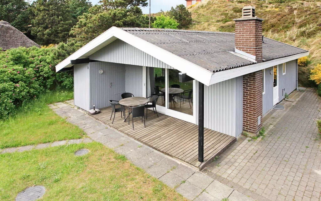 On a sheltered and quiet plot, this holiday cottage is located 700 metres from the sea and only 500 metres from the town centre. The house has a combined living and dining room in open connection with the kitchen. The living room is comfortably furnished and has a wood-burning stove. By the windows in the living room, you can access the covered terrace. There are stairs up to a large sand dune found by the house. On top of the dunes there is a bench from where you can enjoy the view of the sunset or dunes.