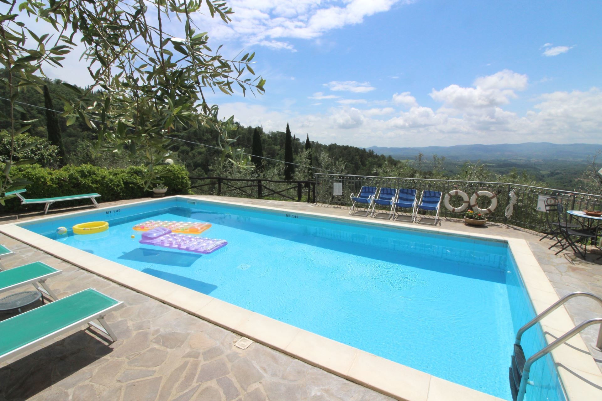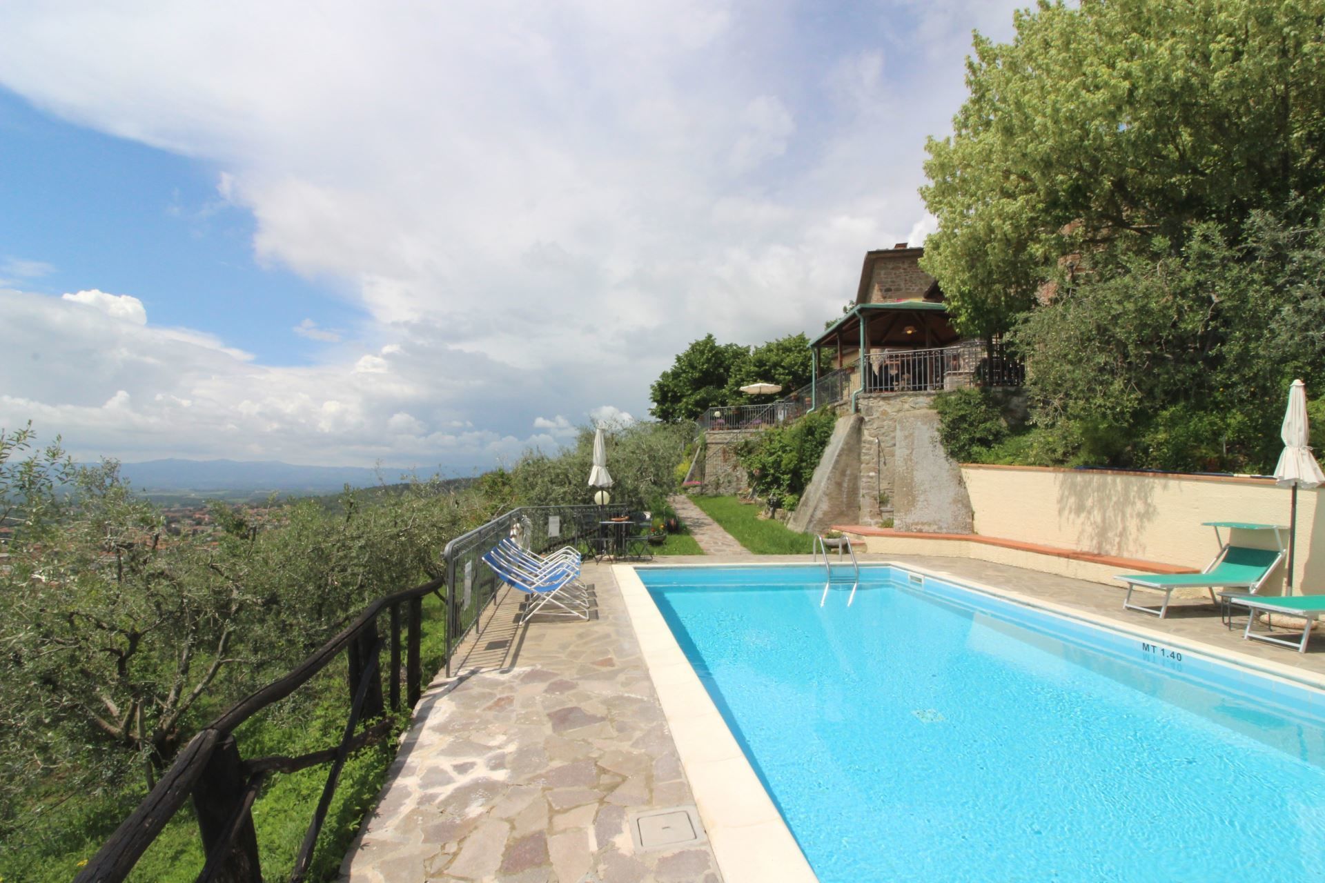 Sur la vaste terrasse naturelle, qui domine à la vallée, a été réalisée la belle piscine entièrement clôturée (10x4,5 m, profondeur 1,40 m) équipée de chaises longues, tables et parasols.