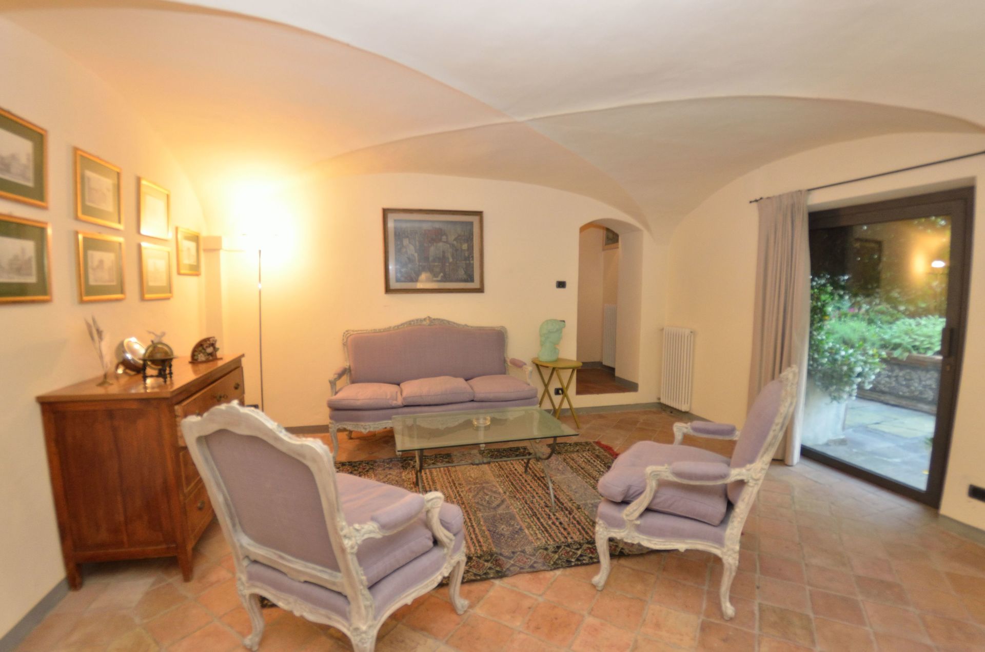 Salon 1: canapé, fauteuil, sortie sur le jardin.