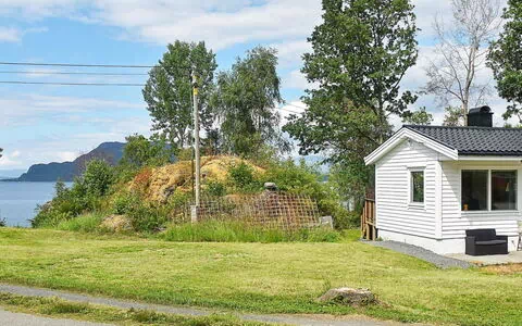 beliggende feriehus med altan og trapp ned til plenen, og nydelig fjordutsikt.