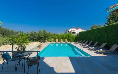 Štinjan à 5 km de Pula: Belle villa "Salamander", de 3 étages. À 3 km du centre de Fažana, situation ensoleillée, à 1 km de la mer, à 1 km de la plage. A usage privé: terrain 1'300 m2 (clôturé) avec plantes et fleurs, jardin propice à la détente, piscine rectangulaire (9 x 5 m, profondeur 140 cm, disponibilité saisonnière: 09.Mai. - 03.Oct.) avec marches intérieures et systeme d'électolyseur au sel. Douche/WC dans l'espace piscine, douche extérieure, terrasse (20 m2), meubles de jardin, espace de jeux pour les enfants (balançoire). Infrastructures de la Maison: accès internet, lave-linge. Place de parking (pour 2 voitures) près de la maison sur le terrain. Magasins 500 m, restaurant 200 m, arrêt de bus 150 m, plage de graviers 1 km, plage aménagée 1 km. Terrain de golf (18 trous) 5 km, ecole de voile 5 km, tennis 500 m, centre équestre 4 km, chemins de randonnées pédestres depuis la maison 500 m, piste cyclable 550 m. Le propriétaire n'accepte pas les groupes de jeunes. Veuillez noter: Aéroport 15 km de la maison. Piscine hydromassage. A usage privé:cuisine extérieure (2 plaques de cuisson, réfrigérateur).