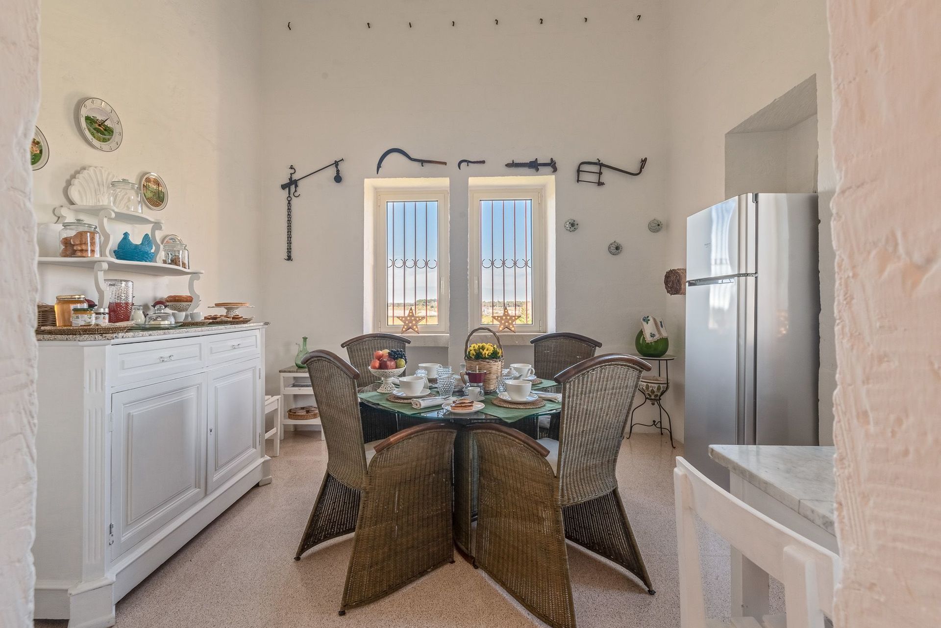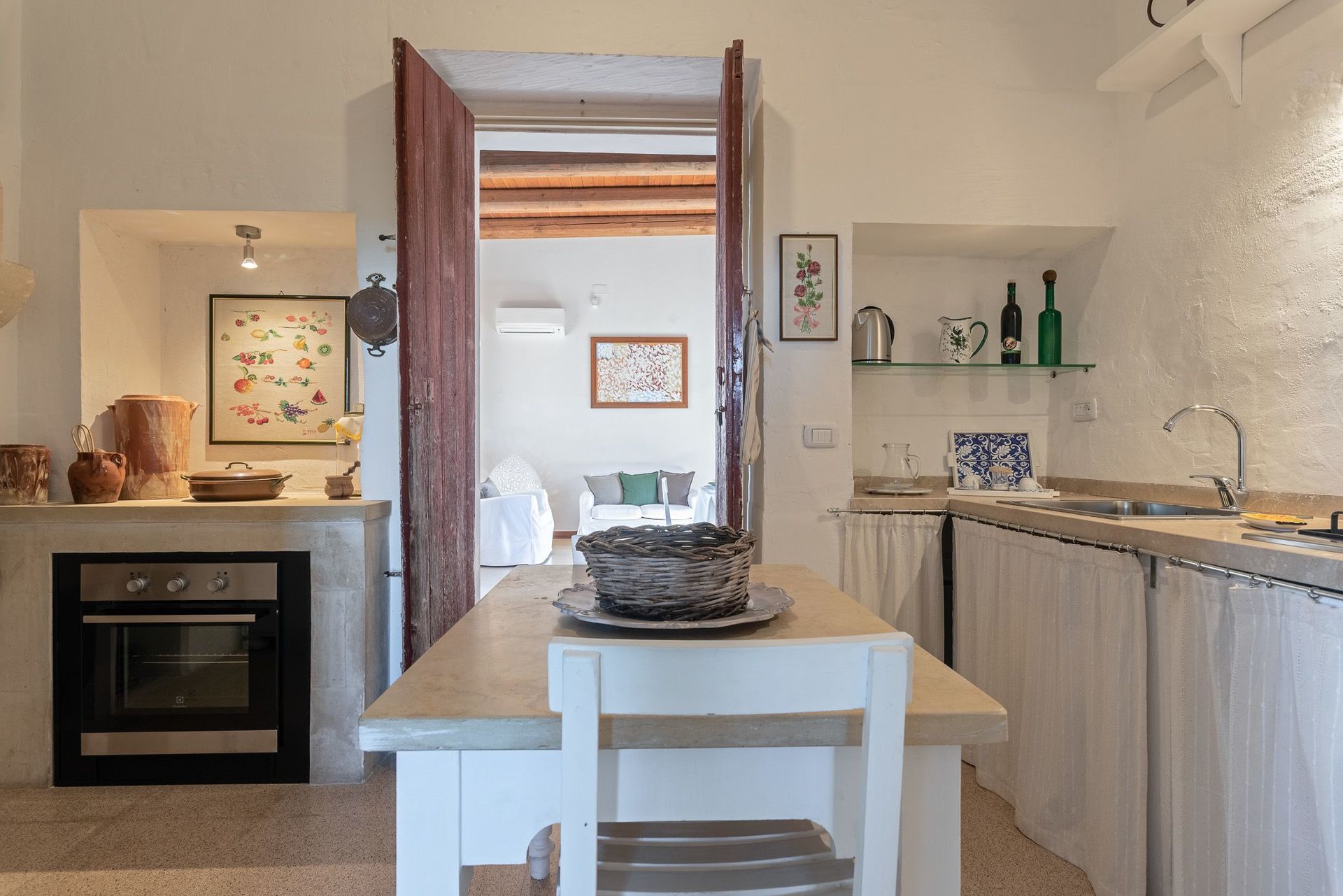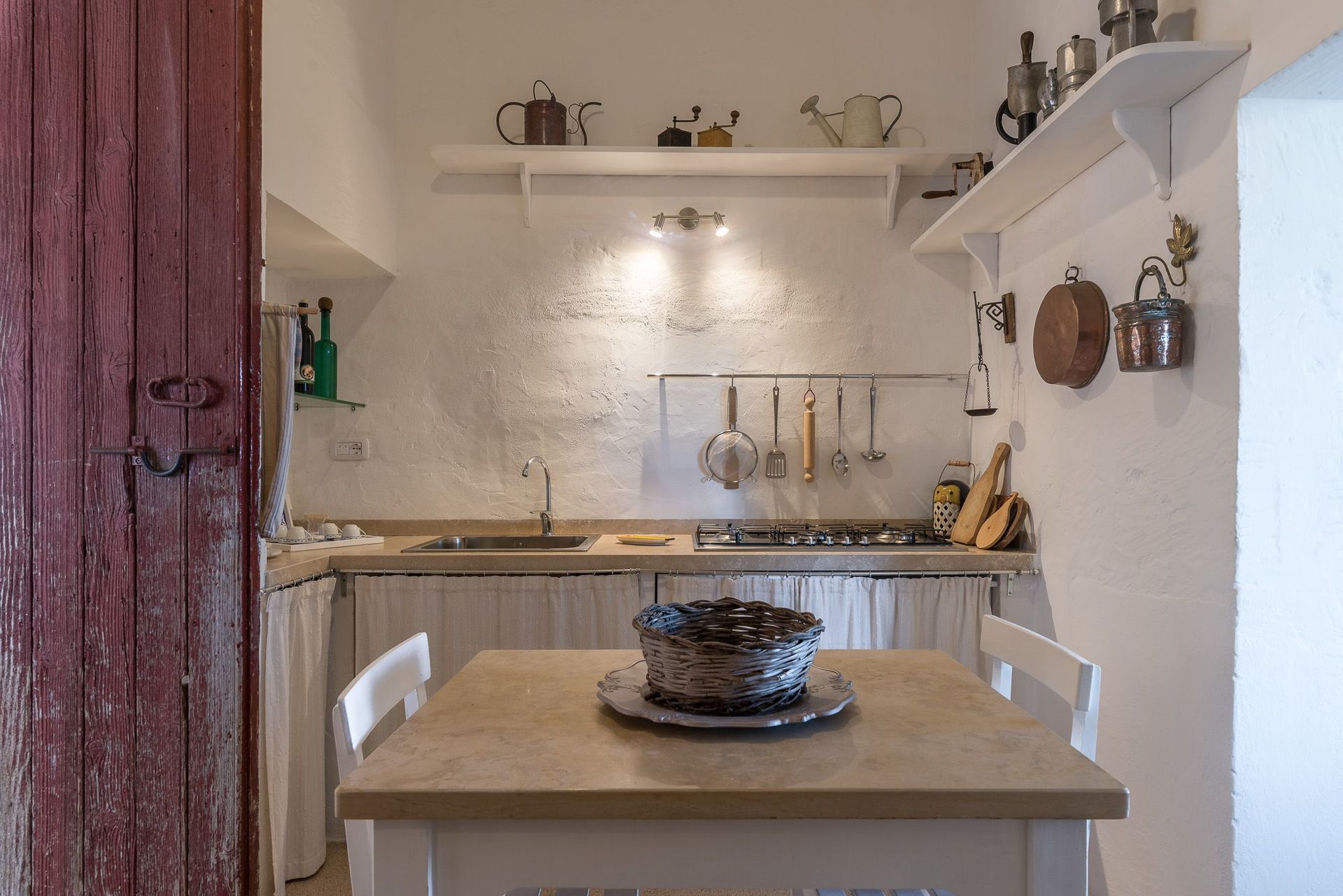From this dining room, you enter a kitchen that is compact but has everything you need to enjoy your stay at Masseria Luci Piccolo. Gas hob, electric oven, microwave, and plenty of pots and pans, so you can cook fantastic dishes, with the locally produced products of Salento.