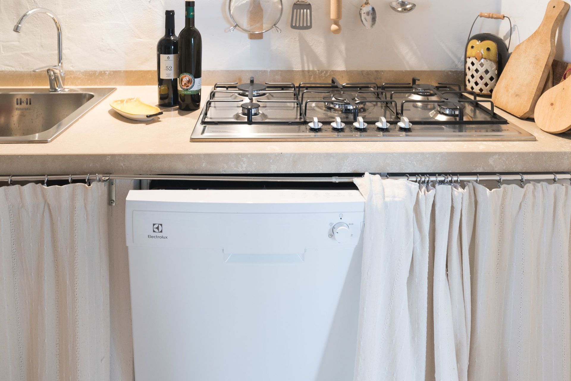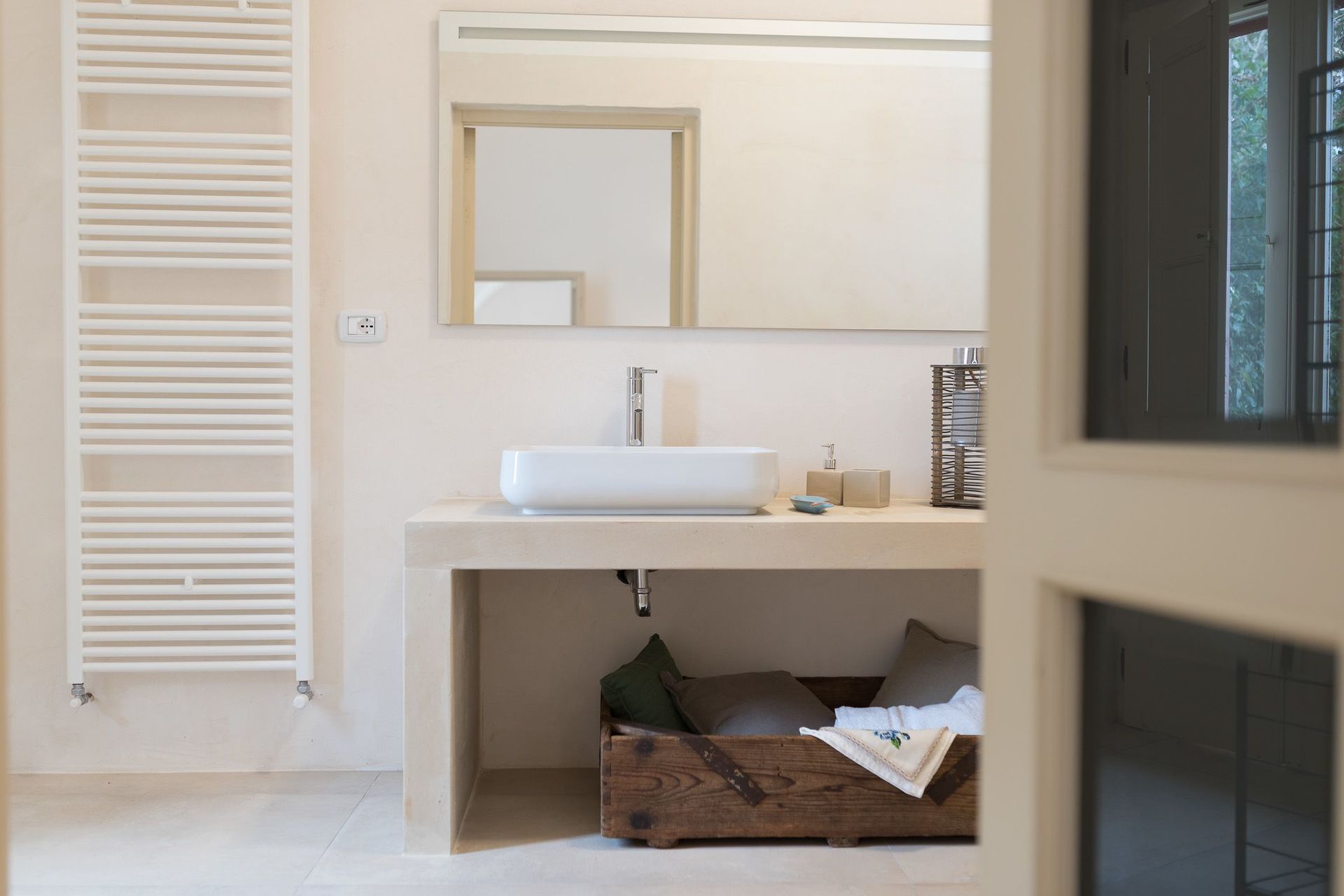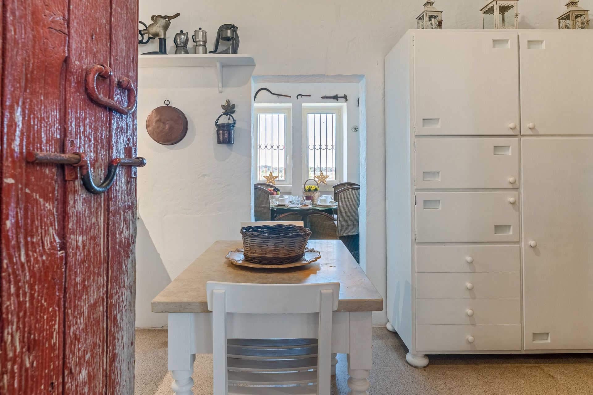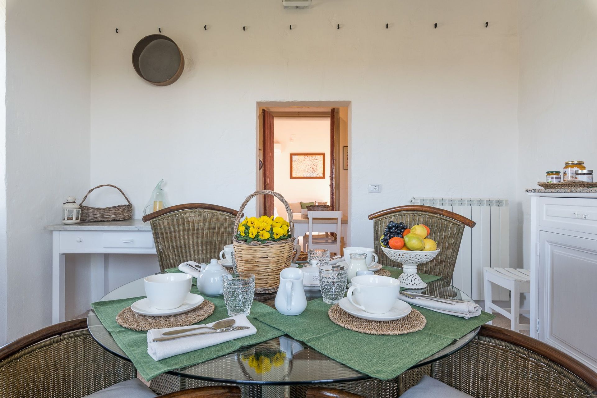 From this dining room, you enter a kitchen that is compact but has everything you need to enjoy your stay at Masseria Luci Piccolo. Gas hob, electric oven, microwave, and plenty of pots and pans, so you can cook fantastic dishes, with the locally produced products of Salento.