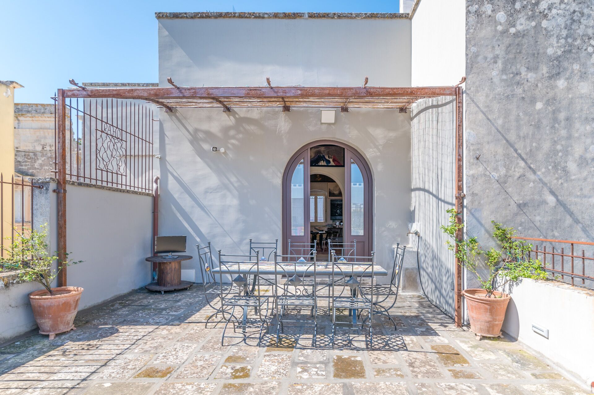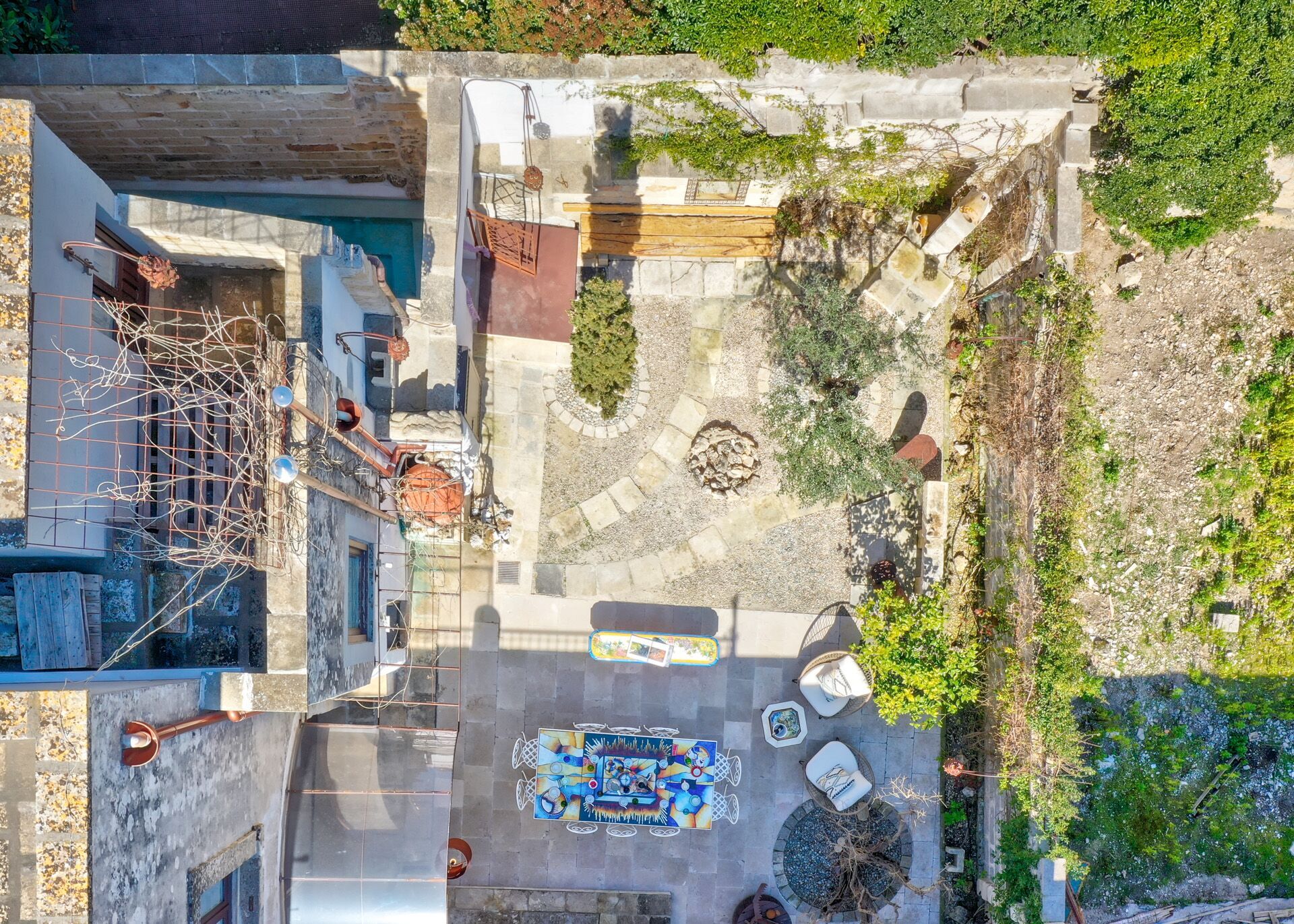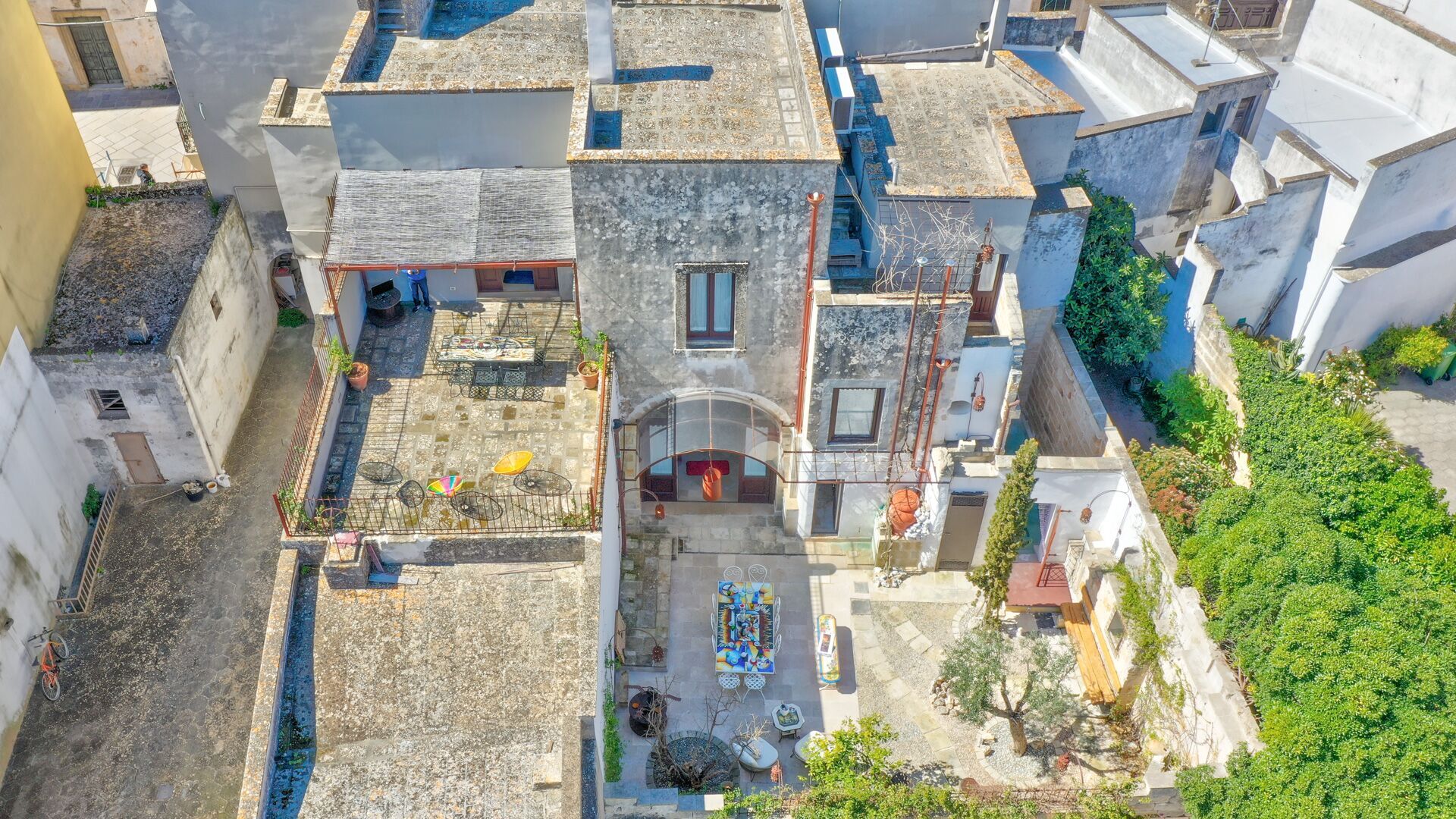 EXTERIOR: on the ground floor there is a beautiful courtyard full of ornamental plants and works of art that frame a large table with chairs, a relaxation area and a small solarium area with sun loungers. From the courtyard there is access to a large stone basin perfect for cooling off on hot summer days. The tub was created in a shaded and reserved area of the courtyard adjacent to the solarium and with convenient access to the outdoor shower.