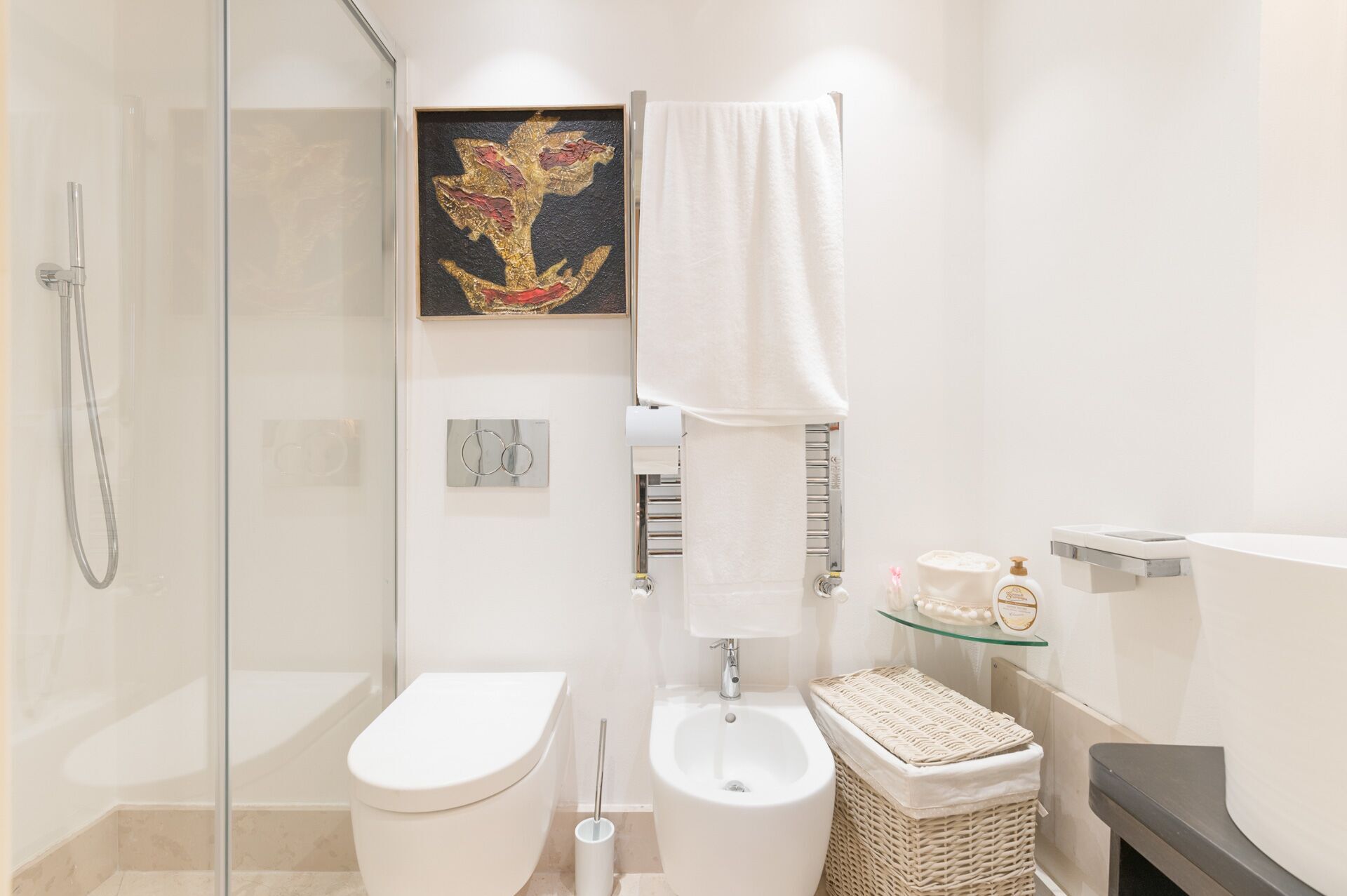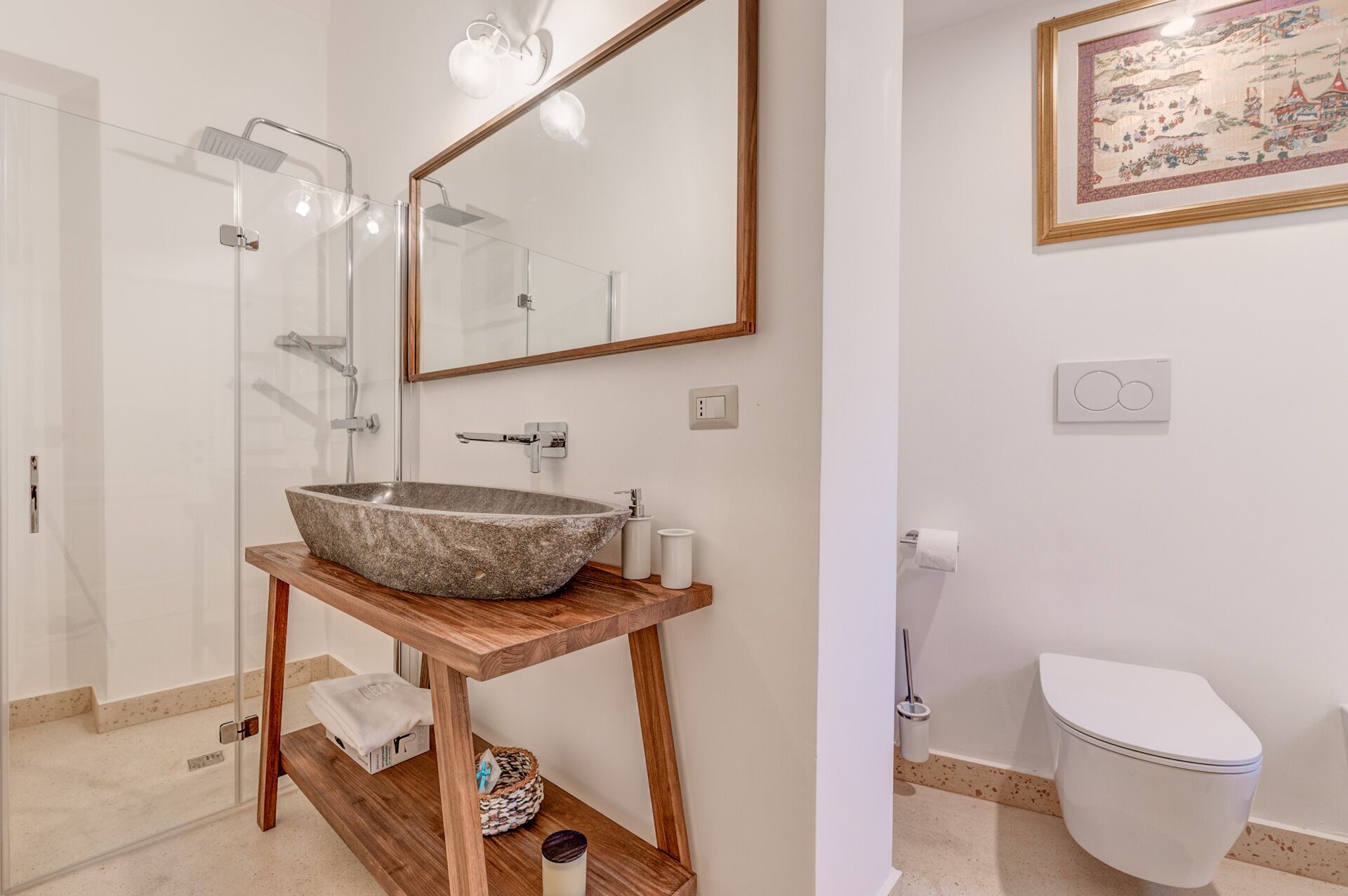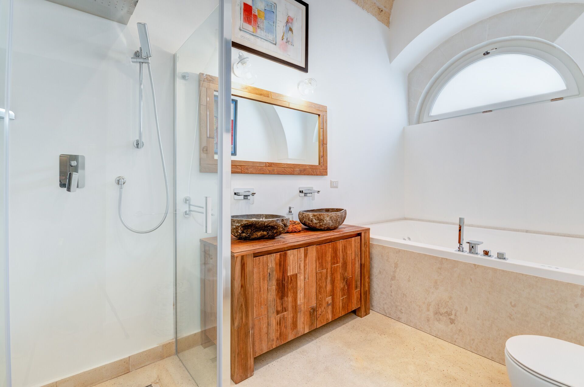 EXTERIOR: on the ground floor there is a beautiful courtyard full of ornamental plants and works of art that frame a large table with chairs, a relaxation area and a small solarium area with sun loungers. From the courtyard there is access to a large stone basin perfect for cooling off on hot summer days. The tub was created in a shaded and reserved area of the courtyard adjacent to the solarium and with convenient access to the outdoor shower.