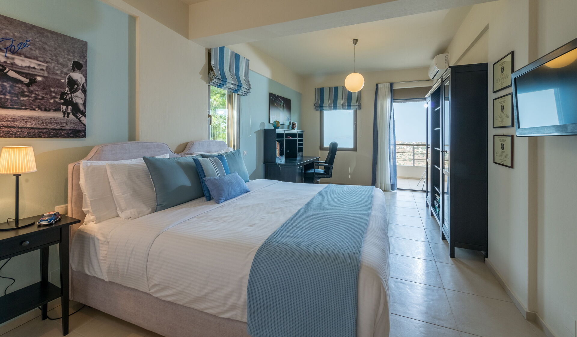 chambre à coucher 2: deux lits à une place, climatisation, tv satellitaire, deux canapés, sortie sur le balcon.