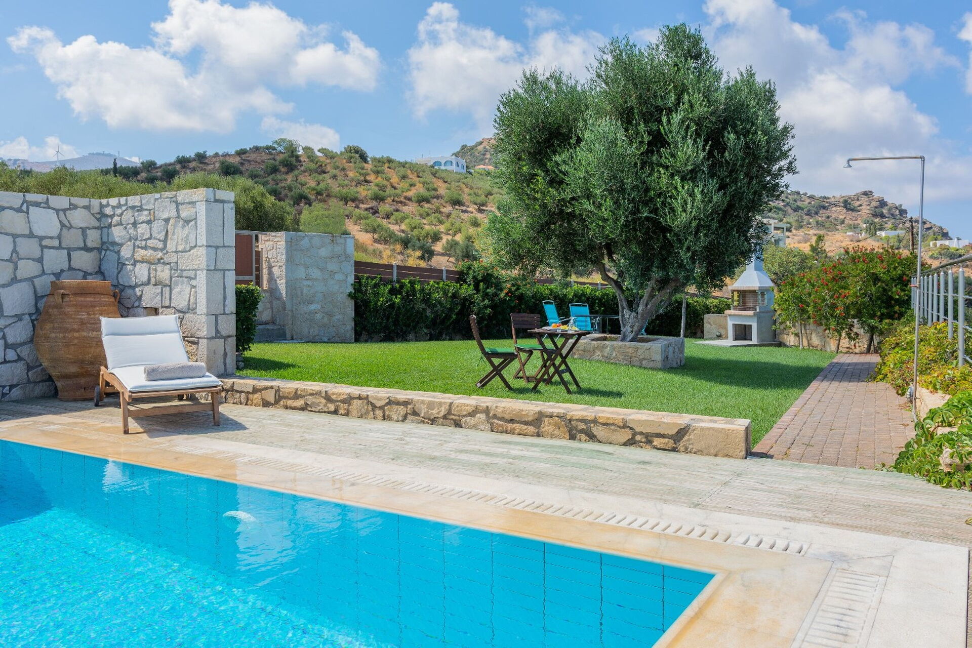 jardin 2: piscine (privé, largeur: 5m, longueur: 8m, profondeur: 1.6m, en plein air), douche, meuble de jardin, chaise longue, clôturé /clôturée, propriété clôturée.