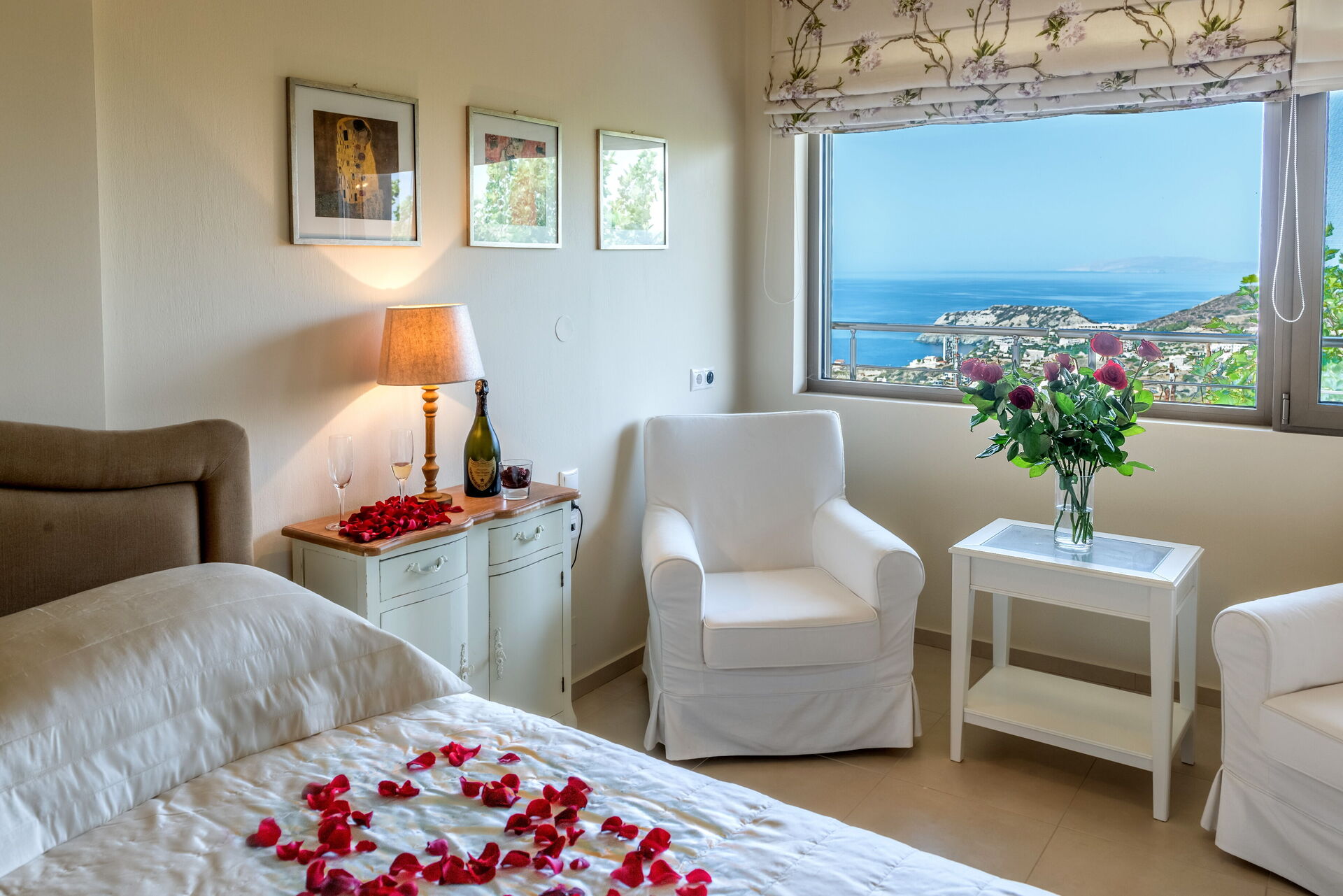 chambre avec salle de bain: lit double, climatisation, tv satellitaire, canapé, deux fauteuils, bassin, wc, douche, sortie sur le balcon.