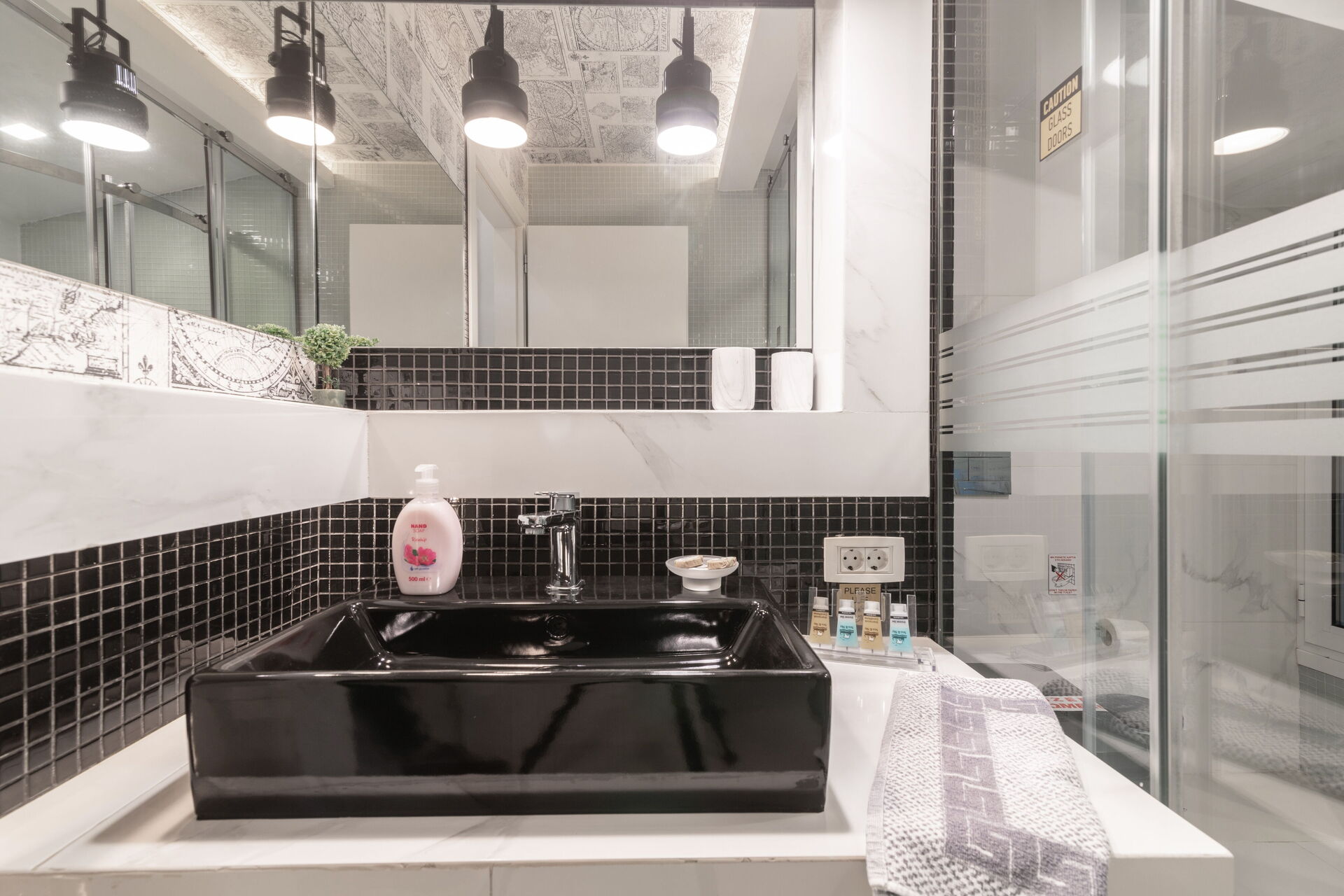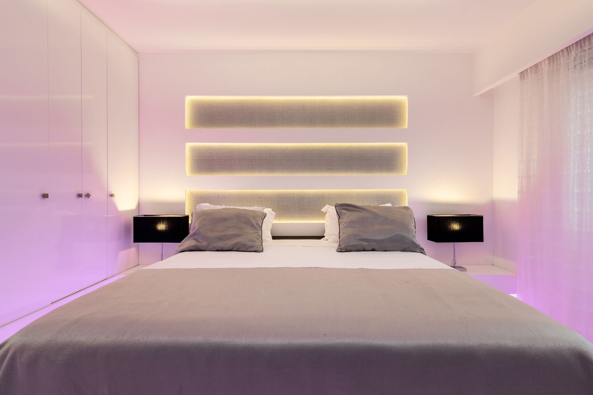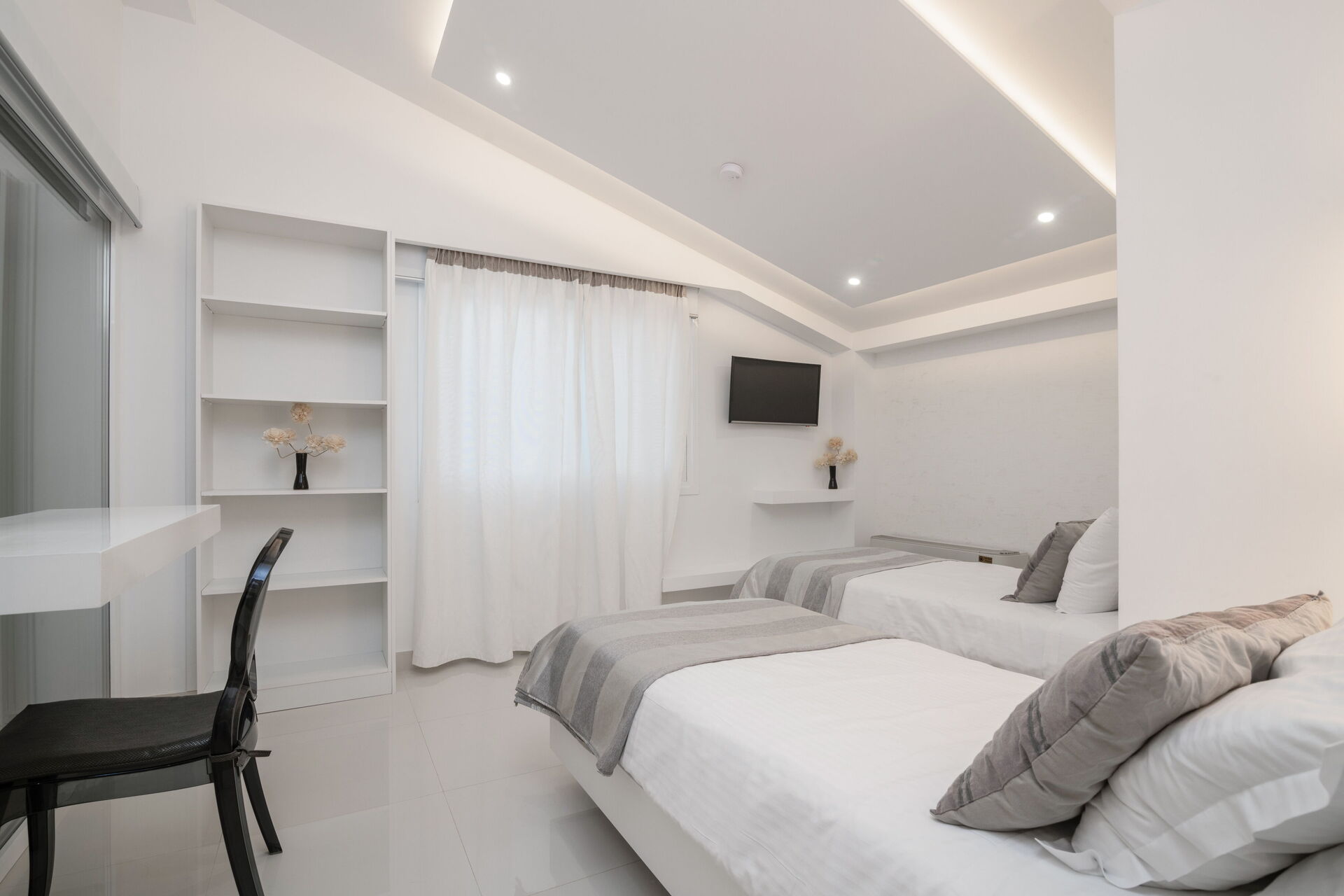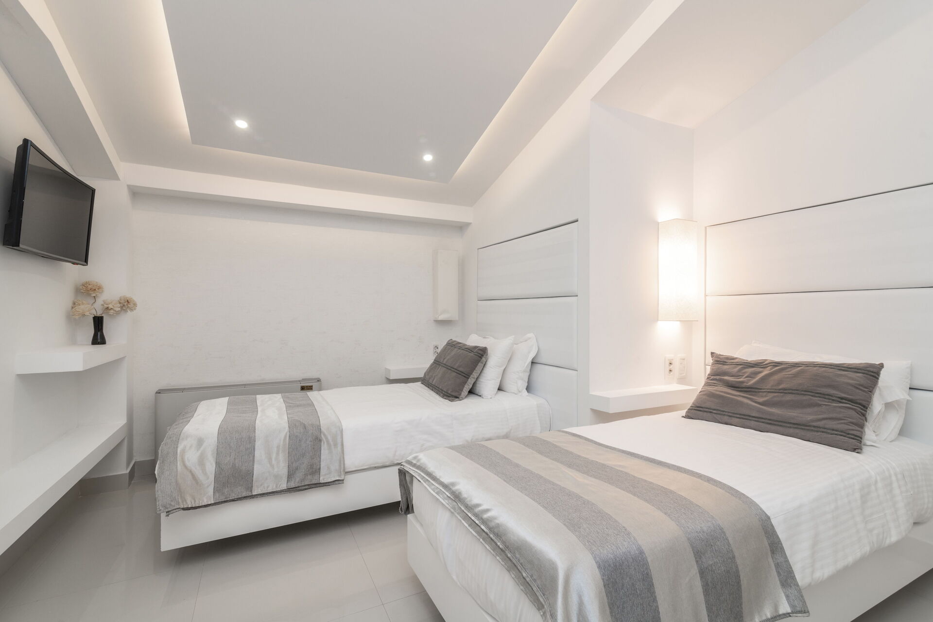 chambre avec salle de bain: lit double, lit de bébé, climatisation, coffre-fort, bagnoire à remous, bassin, wc, bagnoire, fer à repasser, sèche-cheveux, lave-linge.