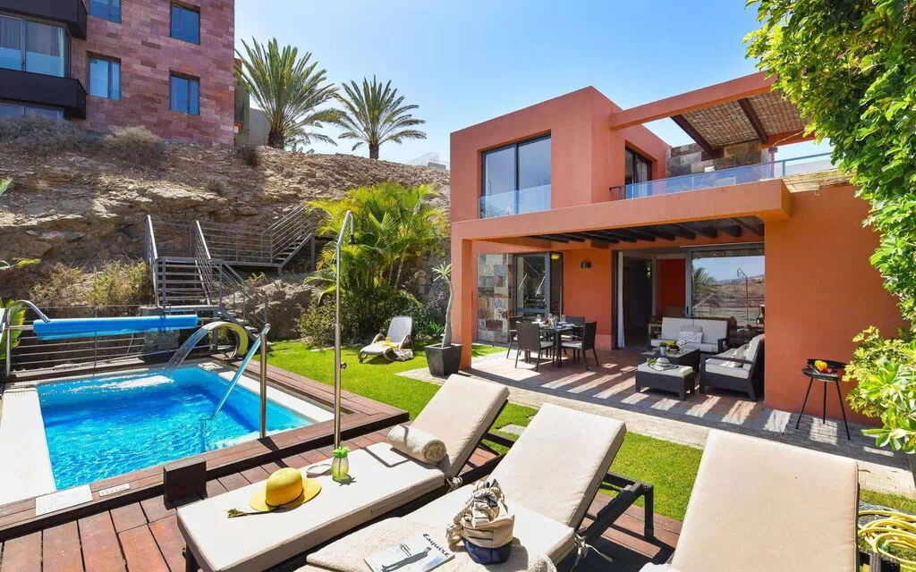 Villa moderne, accueillante, confortable "Las Terrazas 6". Au centre de Salobre Golf Resort, en bordure de la localité Maspalomas en-dehors de la localité Meloneras 7 km, situation ensoleillée, surélevée sur un versant, à 8 km de la plage. A usage privé: jardin (clôturé) avec pelouse, piscine rectangulaire (6 x 2 m, profondeur 140 - 140 cm, disponibilité saisonnière: 01.Jan. - 31.Dec.). Douche extérieure, place de parking sur le terrain, parking public possible dans la rue. Magasins 1 km, magasin d'alimentation 1 km, supermarché 2.5 km, restaurant 100 m, arrêt de bus "Las Crucitas" 19 km. Terrain de golf (18 trous) 500 m. Veuillez noter: voiture recommandée. Le propriétaire n'accepte pas les groupes de jeunes. Autoroute 2 km de la maison. Route principale 500 m de la maison. Environnement très sensible au bruit. Silence et bonne tenue exigés.