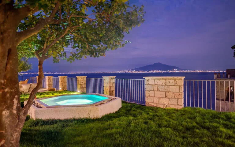 Le jardin privé s'étend sur environ 300 m2 et constitue un refuge extérieur spectaculaire où vous pourrez vous immerger dans la beauté de la côte sorrentine. Une pergola typiquement sorrentine abrite un espace repas extérieur avec une table pour 12 personnes, parfaite pour savourer vos repas en plein air tout en étant entouré par l'atmosphère méditerranéenne. Le jardin comprend un espace barbecue dédié pour des expériences culinaires en extérieur. Vous trouverez un magnifique solarium aménagé avec bains de soleil, chaises longues et parasols, idéal pour travailler votre bronzage tout en profitant des vues spectaculaires sur la mer. Le bain à hydromassage chauffé de 6 places est disponible du 1er avril au 31 octobre, offrant un lieu luxueux pour se détendre de l'aube au crépuscule ou sous un ciel étoilé. Une douche extérieure apporte un confort supplémentaire après la baignade ou les bains de soleil. Le jardin dispose également d'un espace d'exercice pour maintenir votre routine de remise en forme durant votre séjour. Depuis chaque recoin de cet espace extérieur, vous pouvez clairement apercevoir les îles d'Ischia, la ville de Naples et l'imposant Vésuve de l'autre côté du golfe. L'accès à Villa Gilda depuis le niveau de la rue ne nécessite aucune marche, garantissant une entrée facile dans cette remarquable propriété.