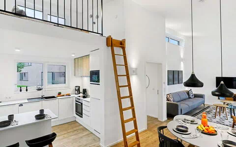 "Lichtblick", maison 3 pièces 85 m2 sur 2 niveaux. Aménagement de bon goût et plaisant: séjour/salle à manger avec TV (satellite) (écran plat). Sortie sur la terrasse. 2 chambres, chaque chambre avec: 1 lit double (2 x 90 cm, longueur 200 cm). Cuisine ouverte (four, lave-vaisselle, 4 plaques vitrocéramiques, grille-pain, bouilloire électrique, micro-ondes, cafetière électrique). Bain/WC, douche/WC. À l'étage supérieur: (échelle) galerie mansardée, ouverte avec 2 couchages. Terrasse. Meubles de terrasse, barbecue électrique. A disposition: lave-linge, sèche-linge, sauna, chaise haute pour enfant (en sus), sèche-cheveux. Internet (Connexion WIFI, gratuit). Veuillez noter: maison non-fumeur. Détecteur de fumée.