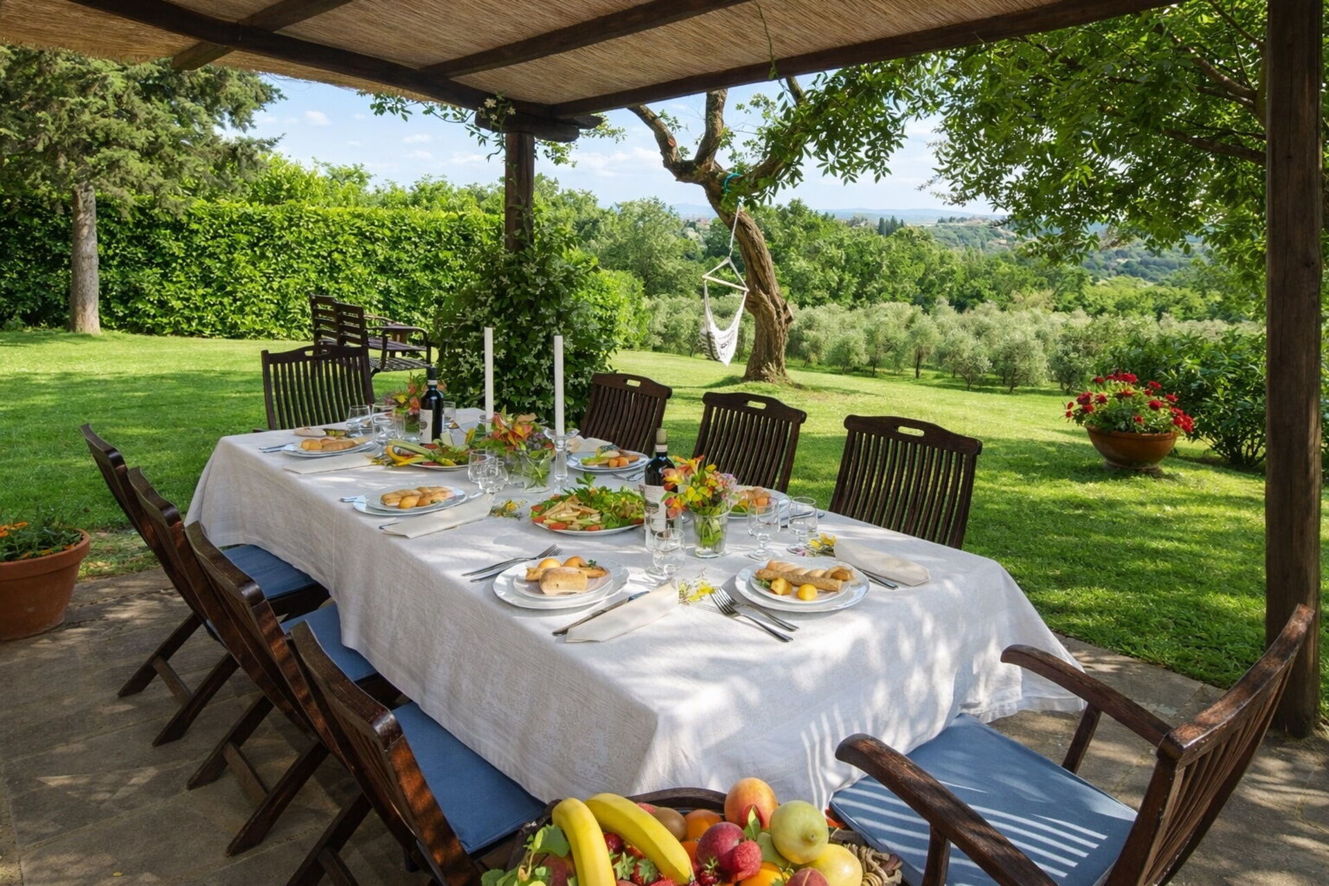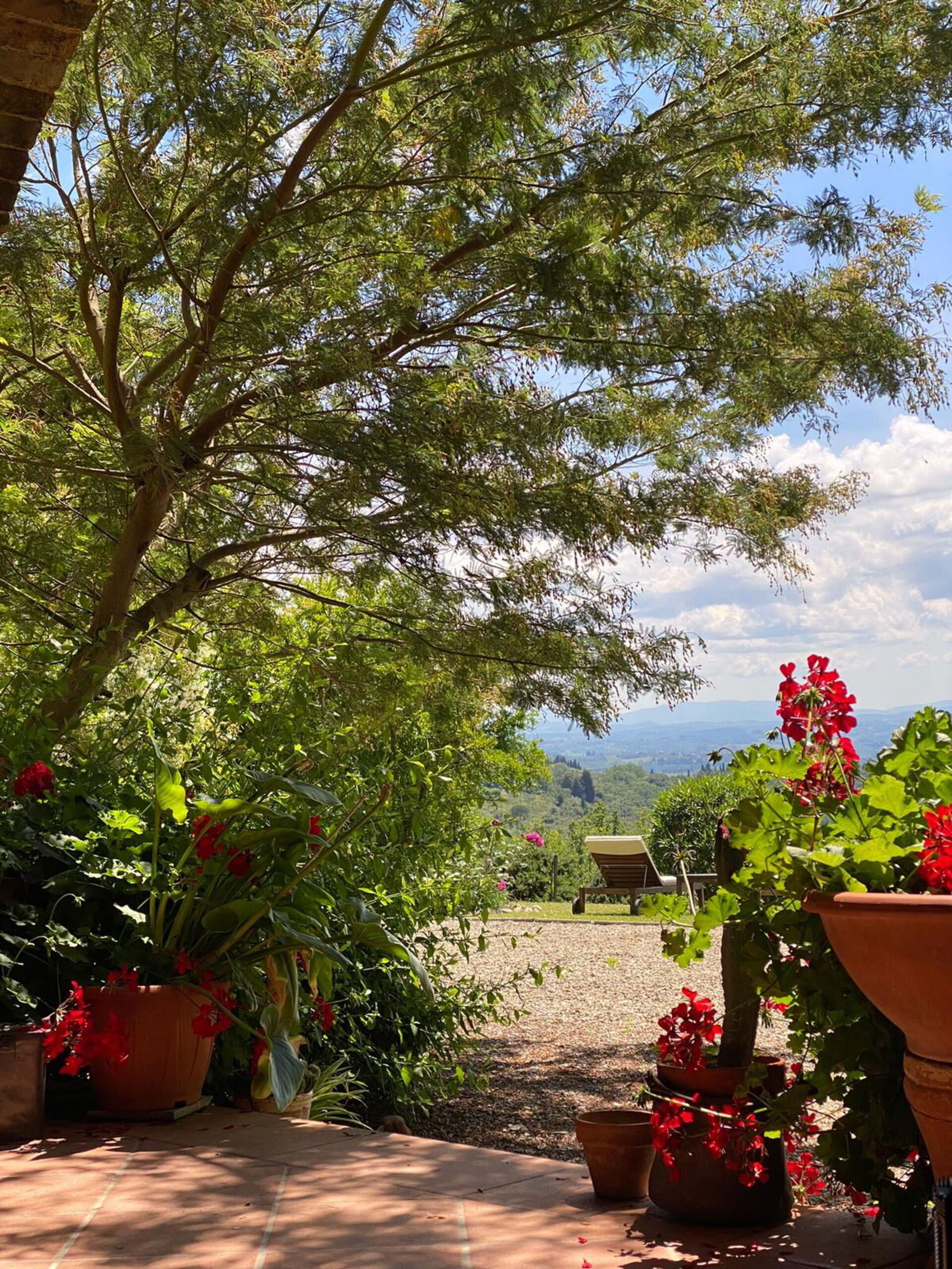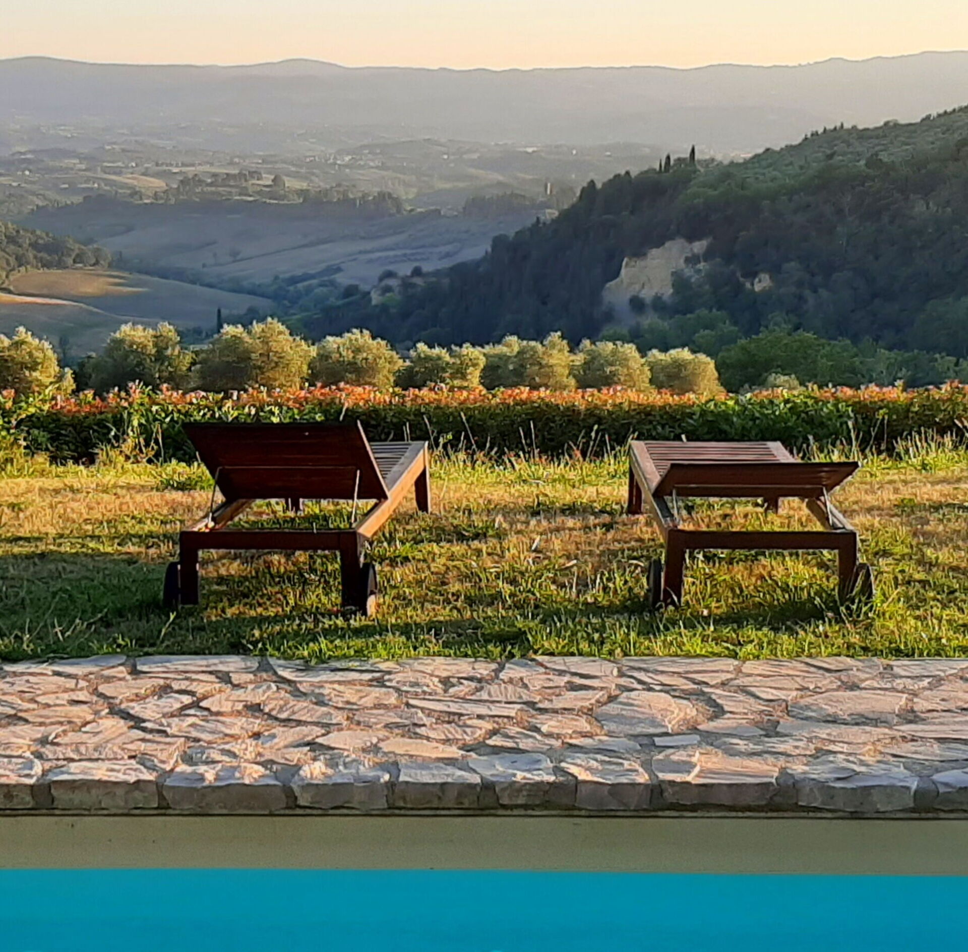 La piscine privée (5 × 10 m) est située dans un espace exclusif entièrement clôturé et offre une vue panoramique exceptionnelle sur les collines du Chianti.