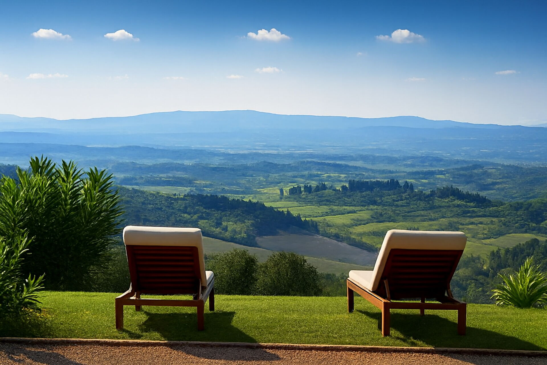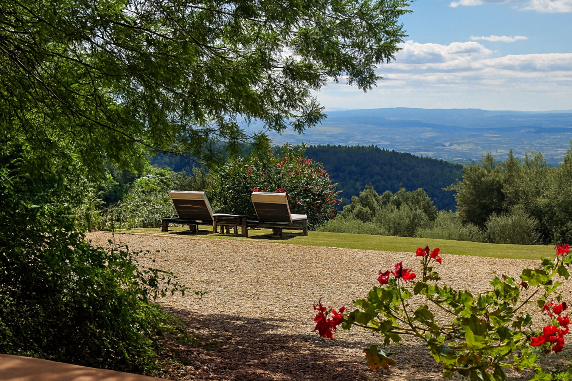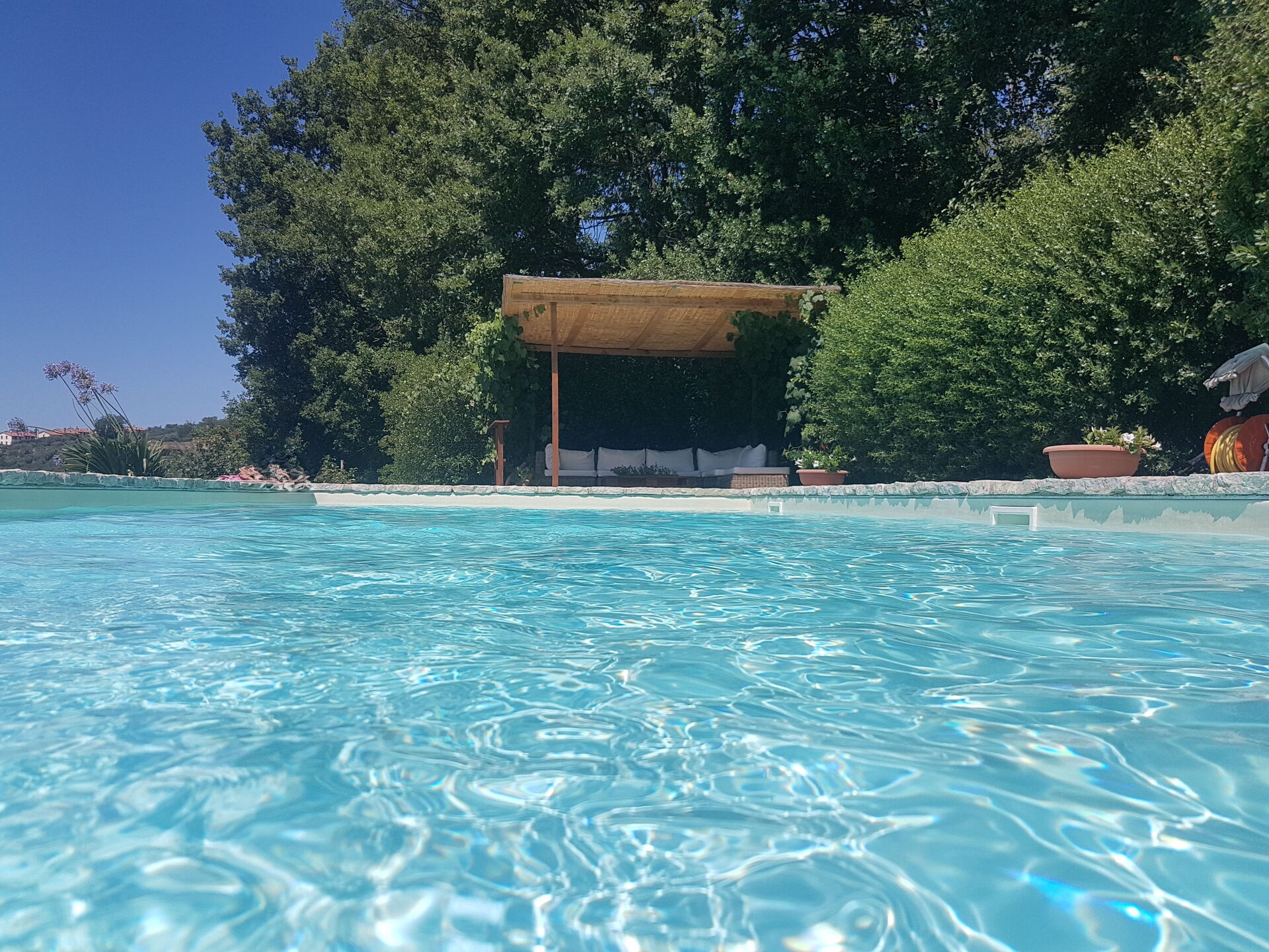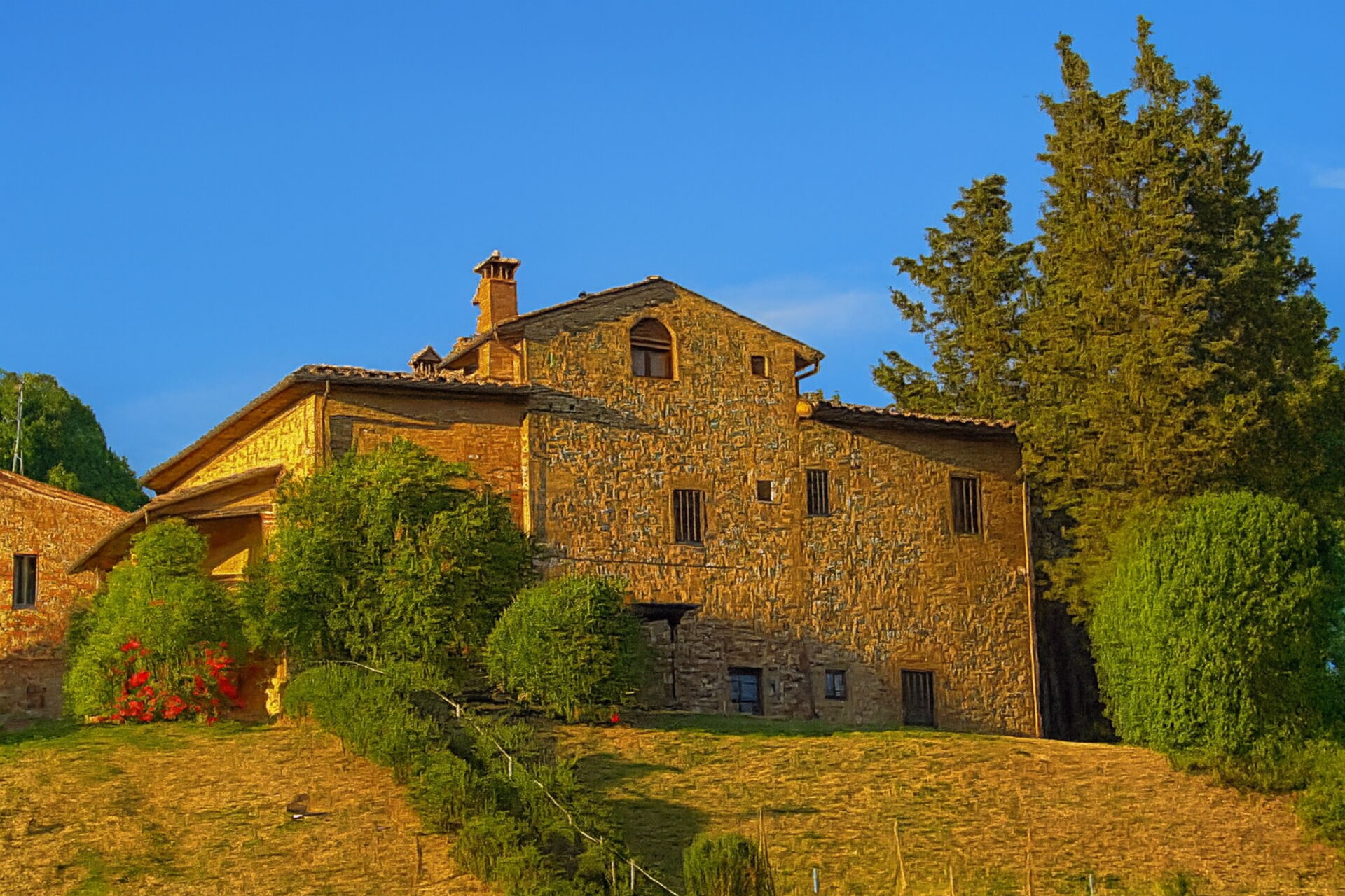 La piscine privée (5 × 10 m) est située dans un espace exclusif entièrement clôturé et offre une vue panoramique exceptionnelle sur les collines du Chianti.