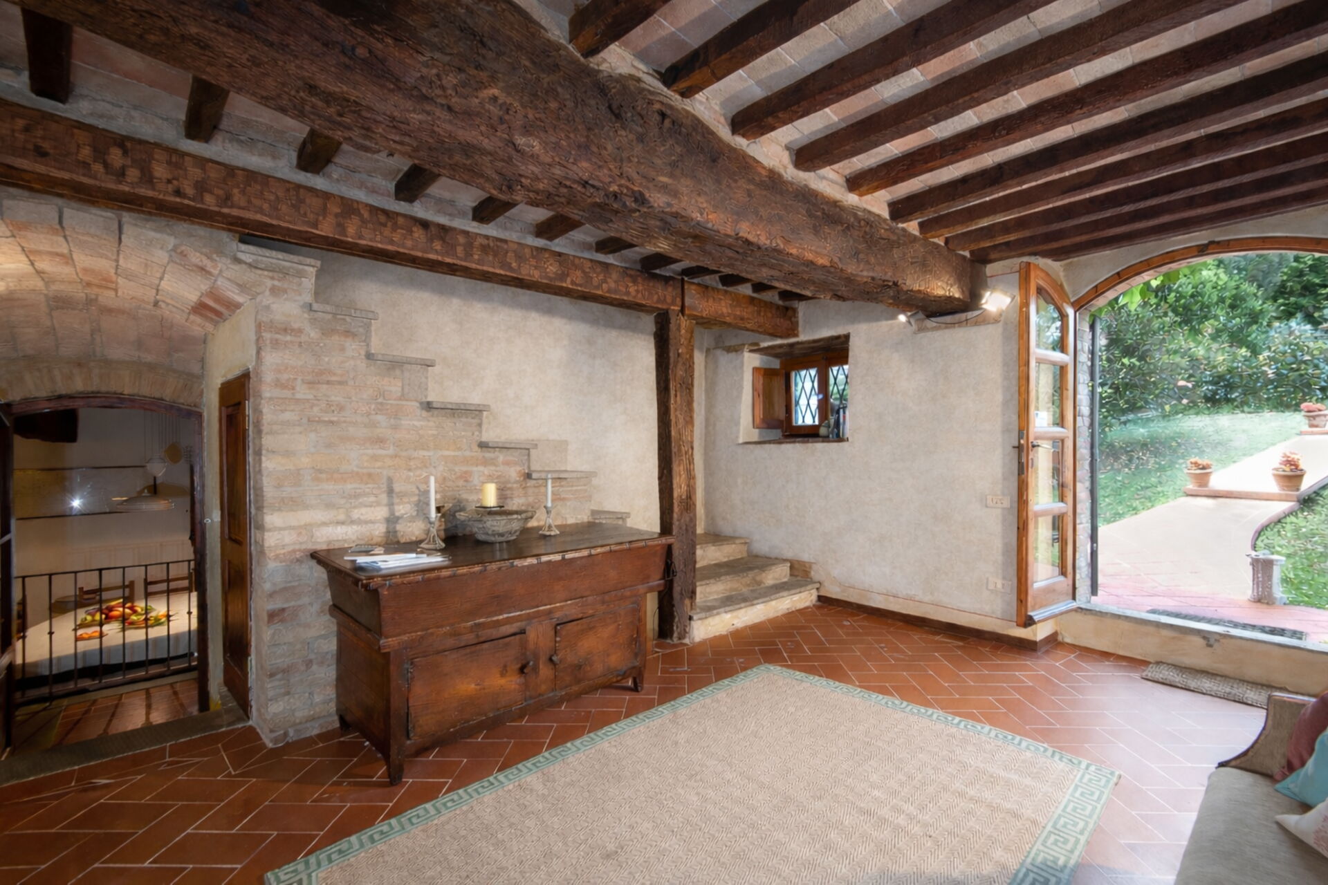 Votre location de vacances est équipée de la climatisation dans toutes les chambres pour maintenir un confort optimal pendant votre séjour, tandis que le chauffage est disponible pour les mois plus frais. La cuisine est équipée de commodités modernes incluant un lave-vaisselle, un micro-ondes et tout l'équipement de cuisine nécessaire réparti sur deux niveaux avec un espace repas pour 10 personnes. Les options de divertissement incluent la télévision par satellite dans l'espace de vie, et une machine à laver est fournie pour votre commodité lors de séjours prolongés. À l'extérieur, vous profiterez d'un accès exclusif à une piscine privée de 5x10 mètres entourée d'espaces de détente ombragés et de vues panoramiques sur la Toscane, un jardin privé avec accès direct depuis la cuisine, et un patio privé avec une loggia couverte parfaite pour les repas en plein air et la détente. Un espace barbecue est disponible pour les repas en plein air, vous permettant de profiter pleinement des magnifiques espaces extérieurs. La villa conserve son caractère toscan authentique avec des sols en terre cuite d'origine, des poutres en bois apparentes et des murs en pierre traditionnels dans toute la propriété, complétés par une cheminée décorative dans le salon. Les services de ménage professionnels suivent des protocoles d'hygiène stricts pour garantir des standards impeccables tout au long de votre séjour.
