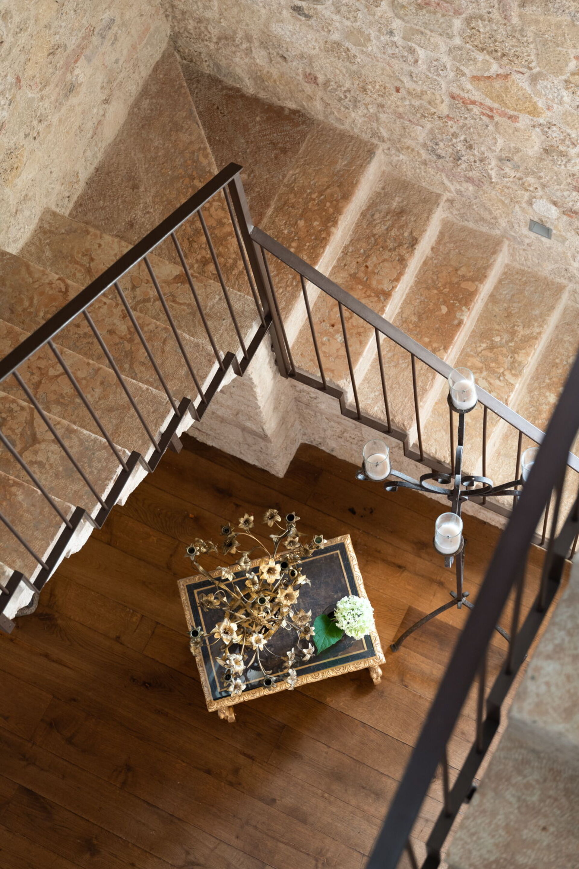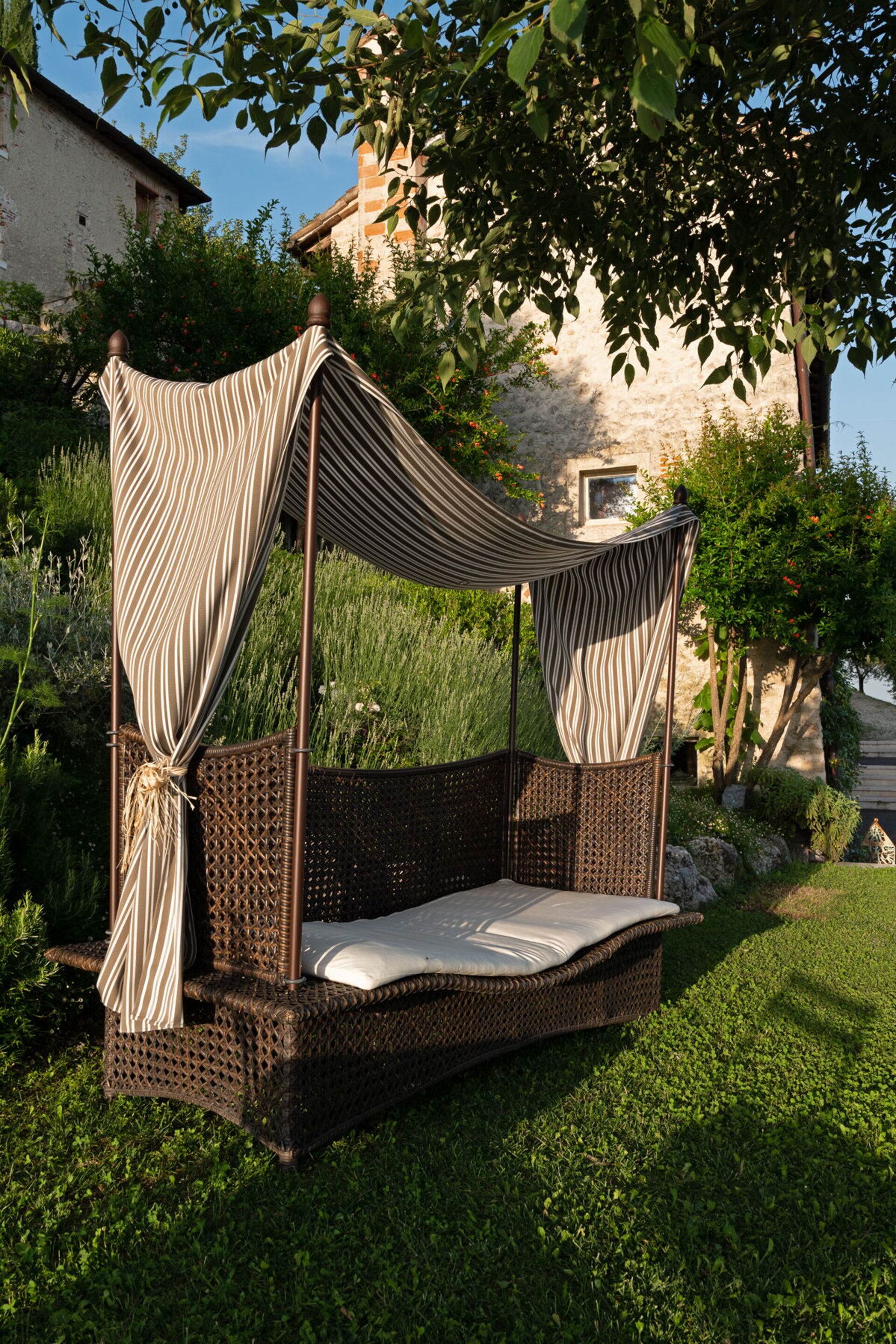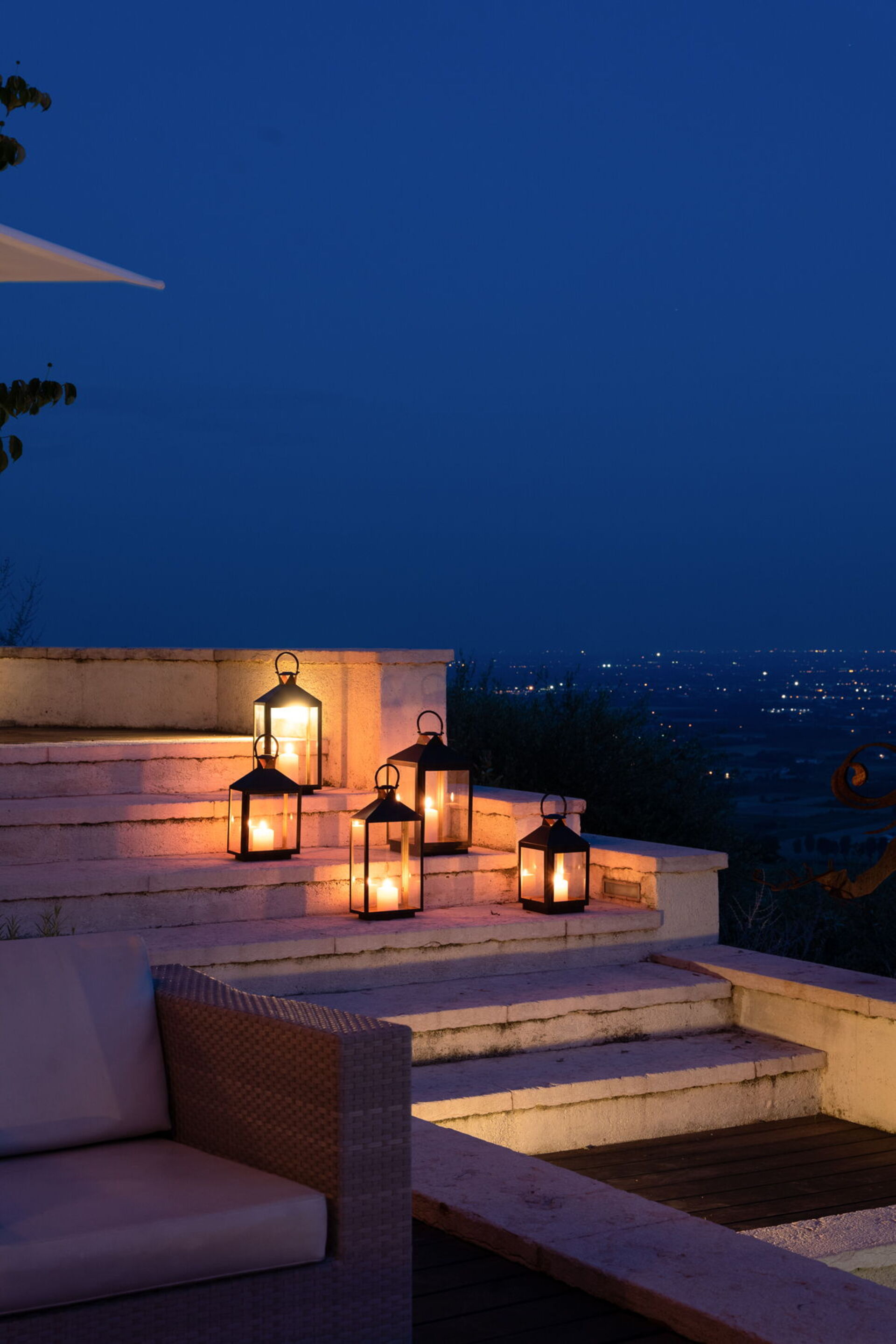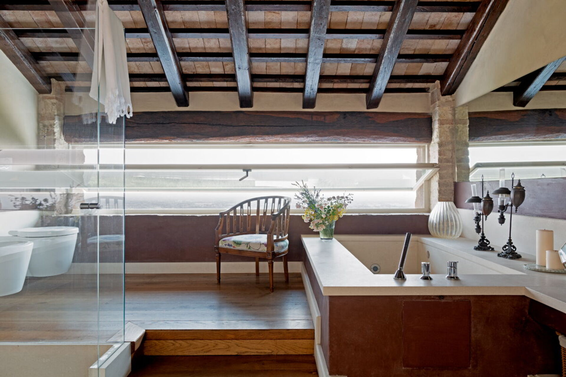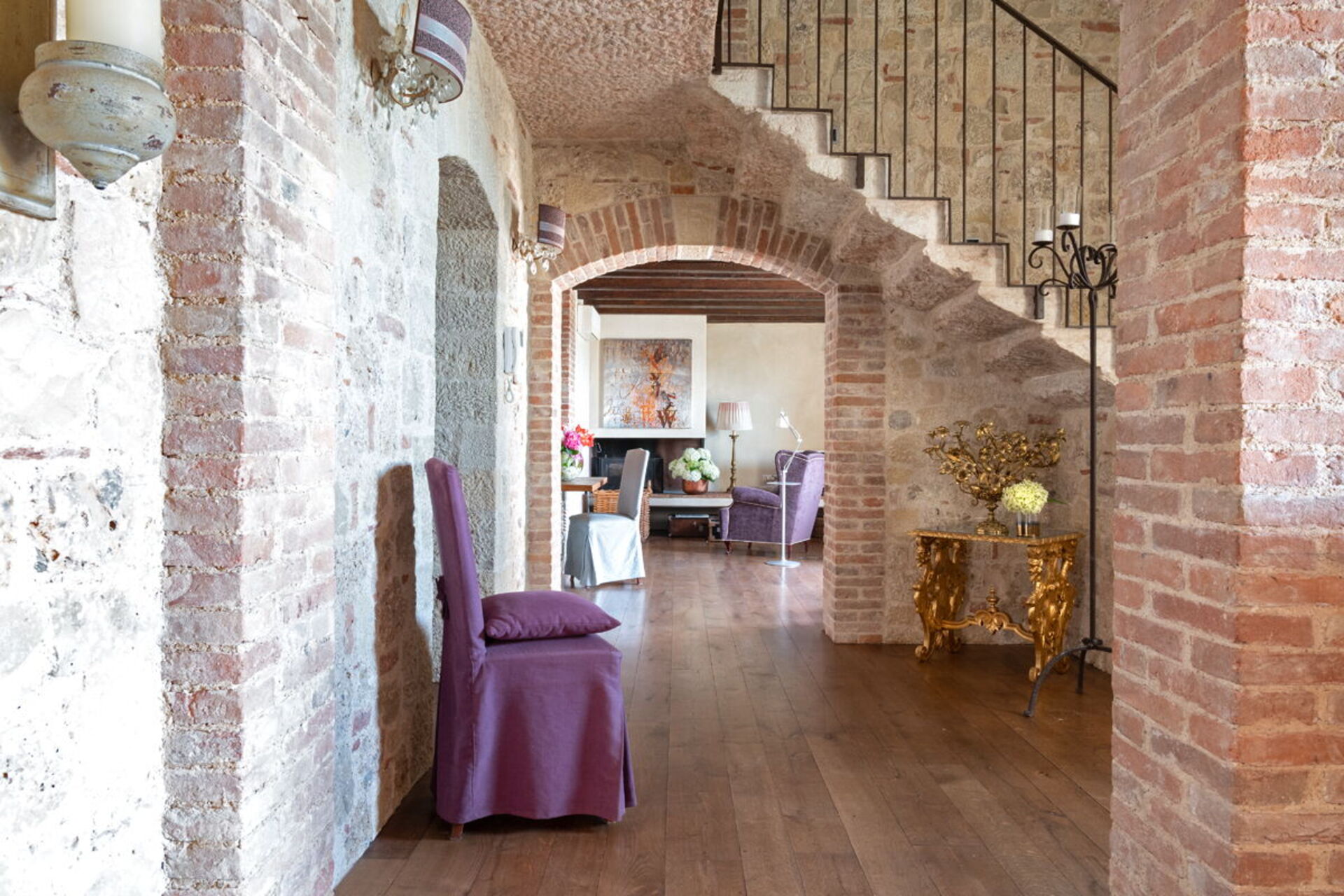 Les espaces extérieurs de cette propriété sont vraiment remarquables, tirant pleinement parti du cadre spectaculaire au sommet de la colline. Vous trouverez une piscine privée où vous pourrez vous détendre tout en admirant les vues à couper le souffle. La terrasse panoramique est équipée de mobilier d'extérieur confortable, offrant un espace idéal pour les repas en plein air et les réceptions tout en profitant des vues imprenables sur le paysage. Le vaste terrain de 5 hectares offre un espace généreux pour des promenades tranquilles et une intimité totale, vous permettant de vous immerger pleinement dans l'environnement paisible de la campagne d'Asolo.