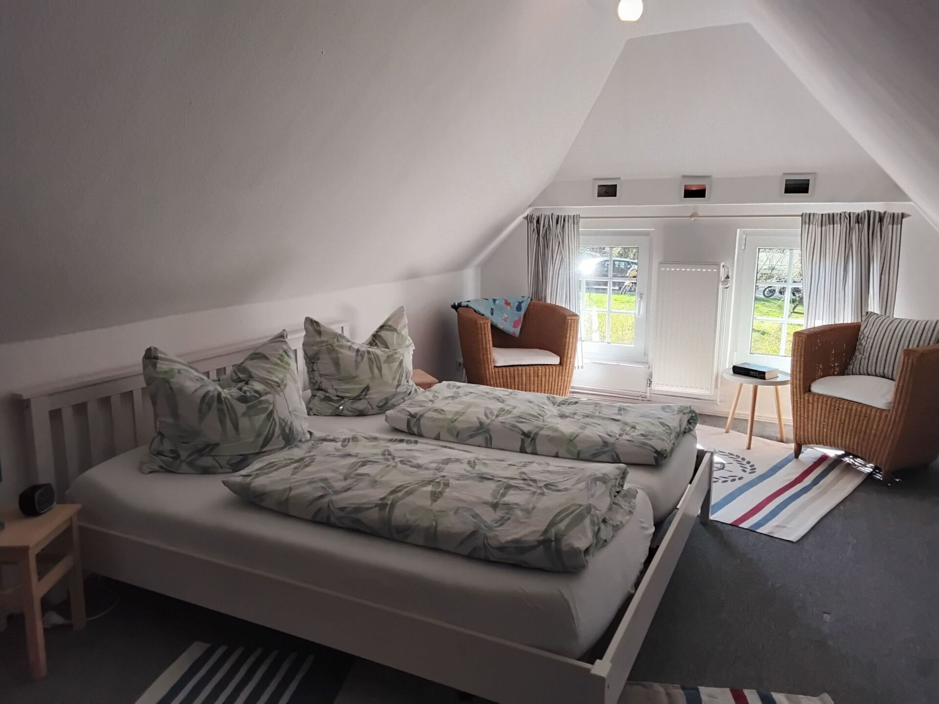 The 75m² house was extensively renovated in 2013. Two adults, two children and a dog can enjoy their holiday here from the very first moment. The two bedrooms are on the upper floor, each with a double bed, and a cot can be provided on request free of charge. The lower floor has a shower room and a big living room flooded with daylight, comprising a kitchen unit, a dining space and a sofa corner. The kitchen unit is equipped with a three-ring ceramic hob, a cooker hood, a convection oven and a dishwasher, and an adjacent standing fridge with a big freezer compartment. The lounge corner provides a two-seater and a three-seater sofa, satellite TV and a DVD player.