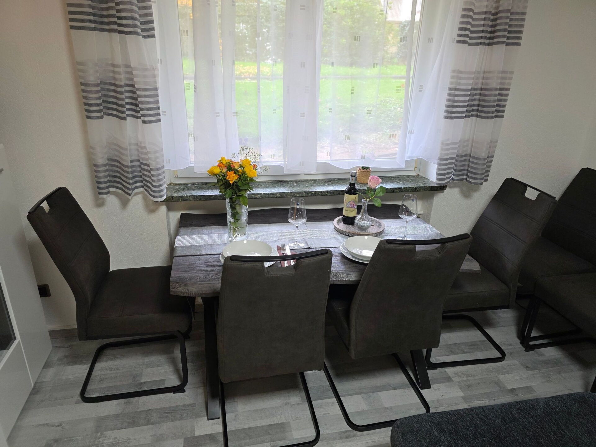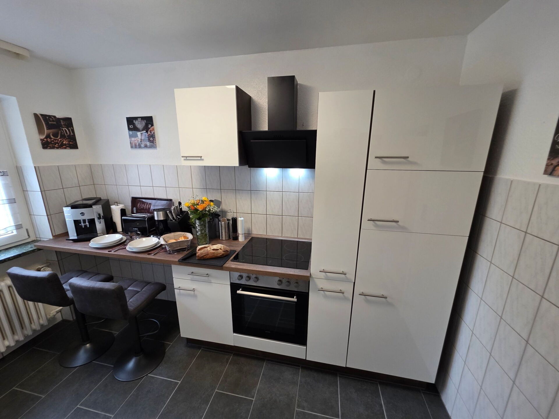 The kitchen is fully equipped. The highlight is the fully automatic coffee machine which is operated with whole beans (very tasty coffee!!). If you don't want to have breakfast in the dining room, there is a nice place with 2 stools in the kitchen.