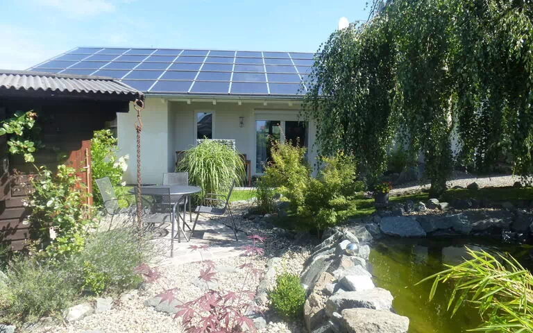 Here you are renting a 79m² holiday house with a living room and a well-equipped kitchen with a dining table. A bathroom with a bathtub, barrier-free shower and WC is also available. A hallway and two bedrooms, one with a double bed and the other with a single bed and a bunk bed, as well as an open gallery with two beds. Wi-Fi Internet, a dishwasher, tea towels, hairdryer, iron, ironing board, three TVs, electric blinds, a washing machine (payable), a cot and underfloor heating are available.