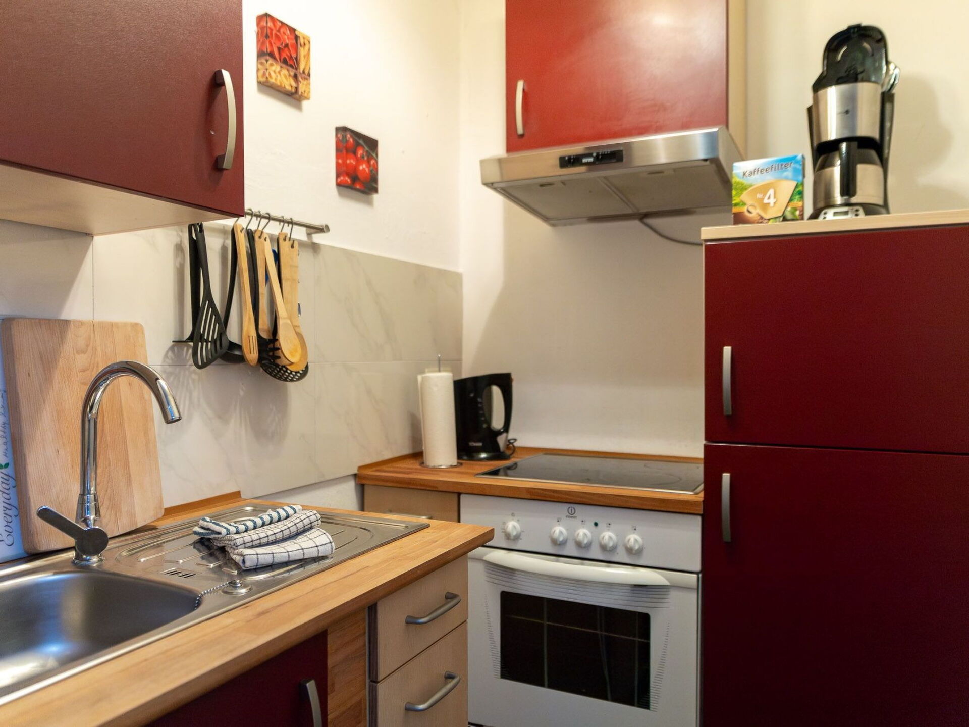 The 40m² apartment can accommodate four people. It consists of a well-equipped built-in kitchen with a stove, oven, coffee machine, toaster, kettle and fridge, as well as a living and dining room with a sofa bed (140 x 200cm). The bedroom has a box spring bed (140 x 200cm), a bedside table with a light and an old rustic wardrobe with a mirror on the door. The daylight bathroom is fitted with a shower and WC. The large living and dining room with a comfortable sofa invites you to relax after a day trip. Up to four people can sit at the dining table for meals together. There is a little built-in kitchen with a four-zone ceramic hob and oven, a built-in fridge with a freezer compartment, a coffee machine, toaster, kettle and everything you need for cooking.