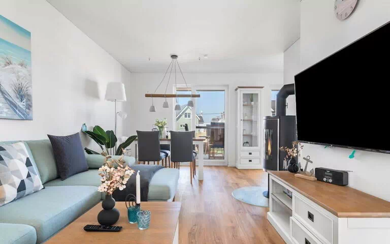 L'intérieur de l'appartement se distingue par un salon et une salle à manger spacieux avec des fenêtres allant du sol au plafond, ce qui crée une ambiance lumineuse. L'aménagement suit un style scandinave et maritime avec des couleurs élégantes qui invitent immédiatement à se sentir bien. Le confort est assuré par un canapé confortable, des sols en parquet, un chauffage au sol et une cheminée chaleureuse. La cuisine intégrée entièrement équipée rend l'appartement attrayant pour les cuisiniers amateurs, tandis que deux chambres à coucher avec lits boxspring et fenêtres du sol au plafond promettent un sommeil réparateur. Le sauna infrarouge dans la salle de bains permet de se détendre après une journée active.