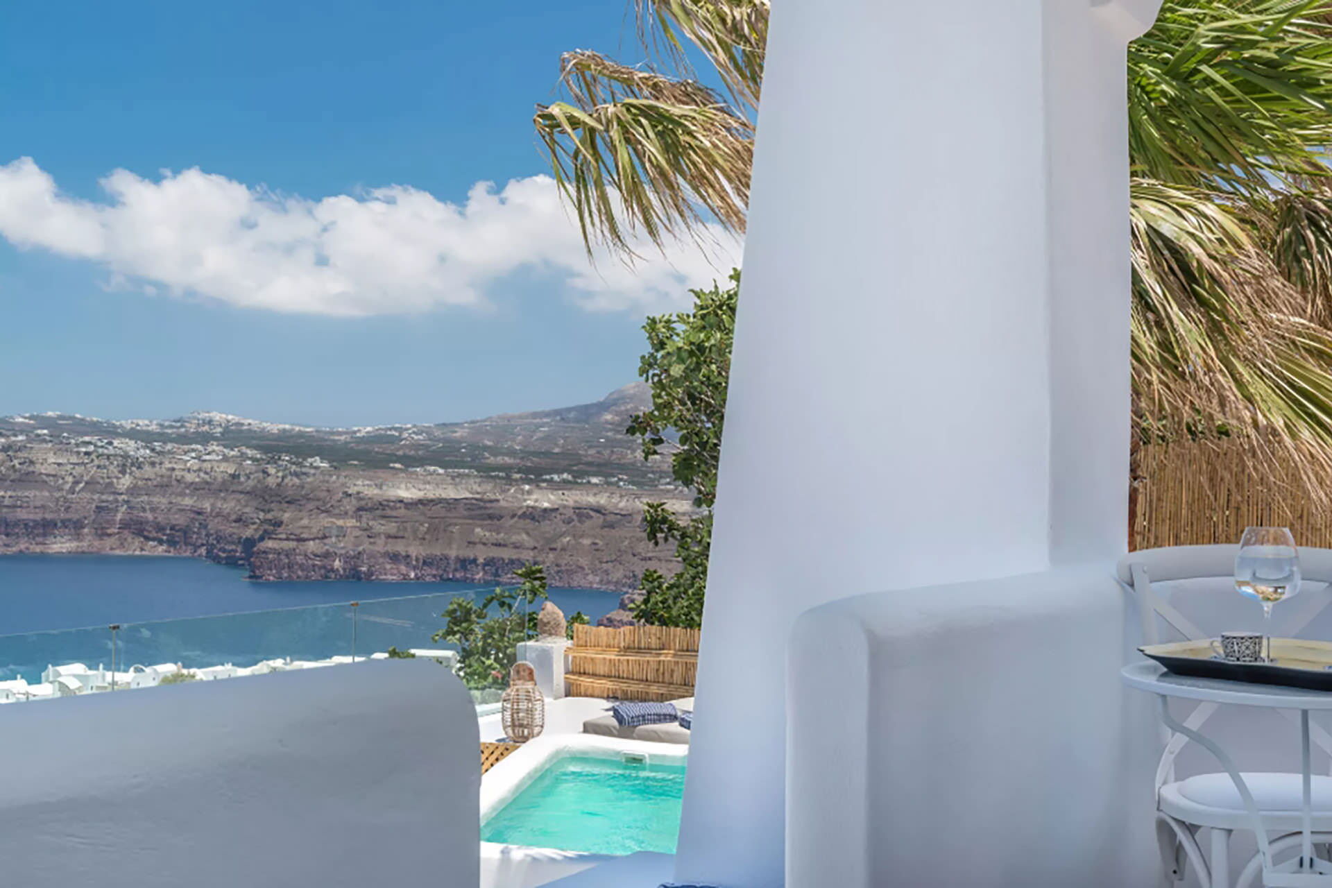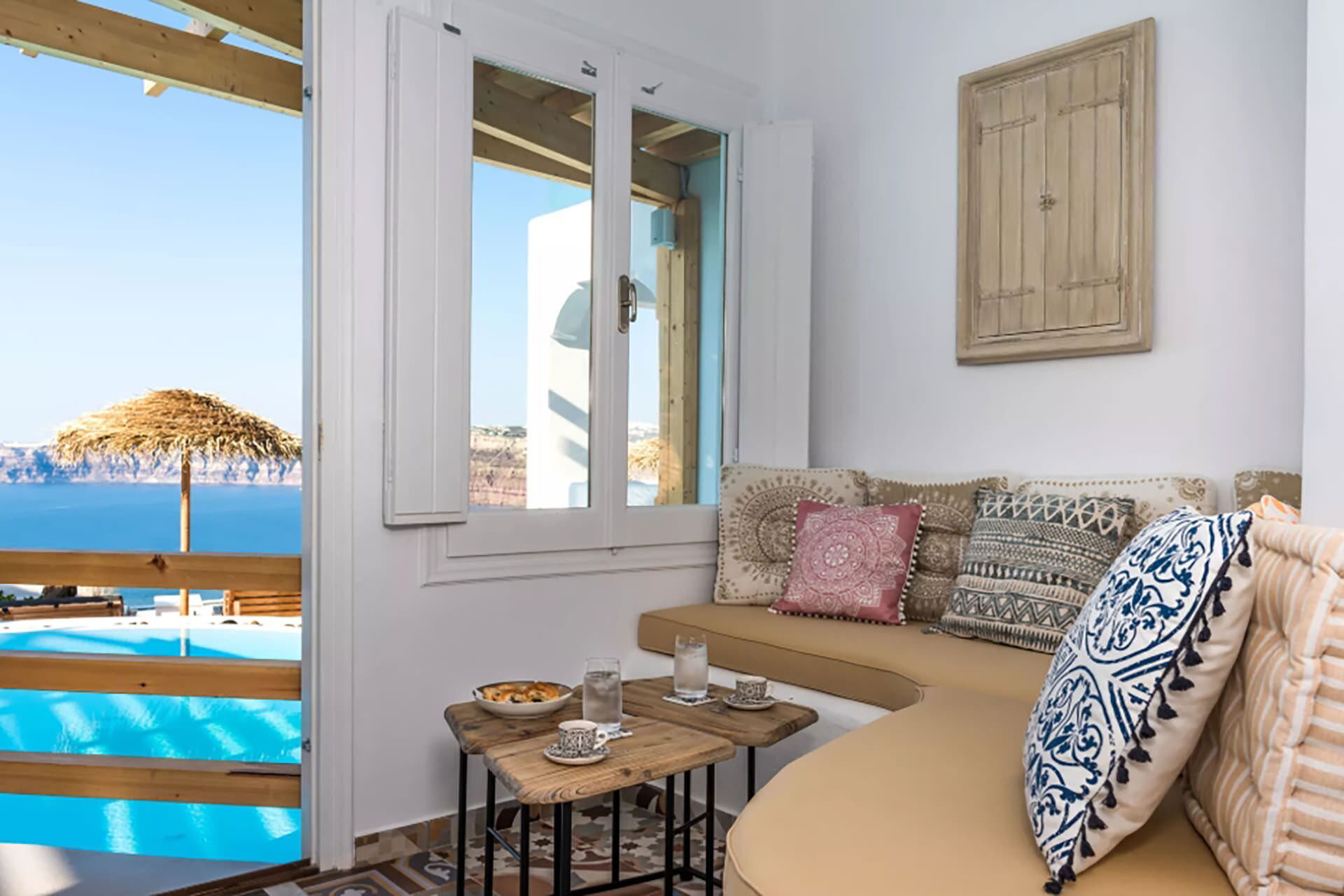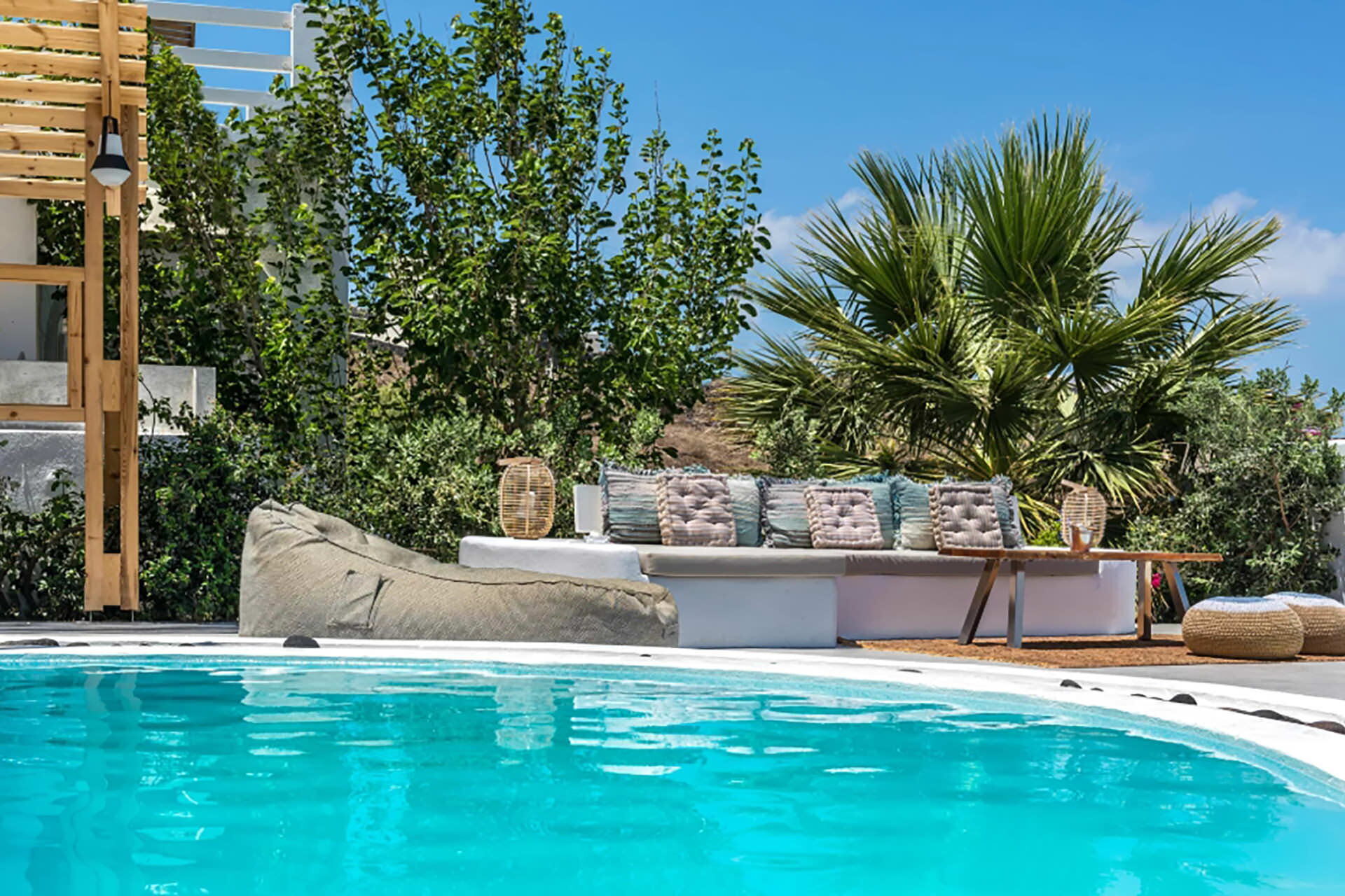 Les espaces extérieurs de Villa Sean sont conçus pour mettre en valeur les paysages naturels environnants. Une piscine privée constitue l'élément central, accompagnée de transats, de mobilier de terrasse et d'un espace dédié aux repas en plein air avec table à manger, le tout offrant des vues sur la caldeira et la mer. Un Jacuzzi extérieur fournit un espace supplémentaire de détente, tandis qu'un petit bar invite à la relaxation. Une terrasse extérieure dédiée est également disponible, adaptée à des activités telles que le yoga ou le Pilates.
