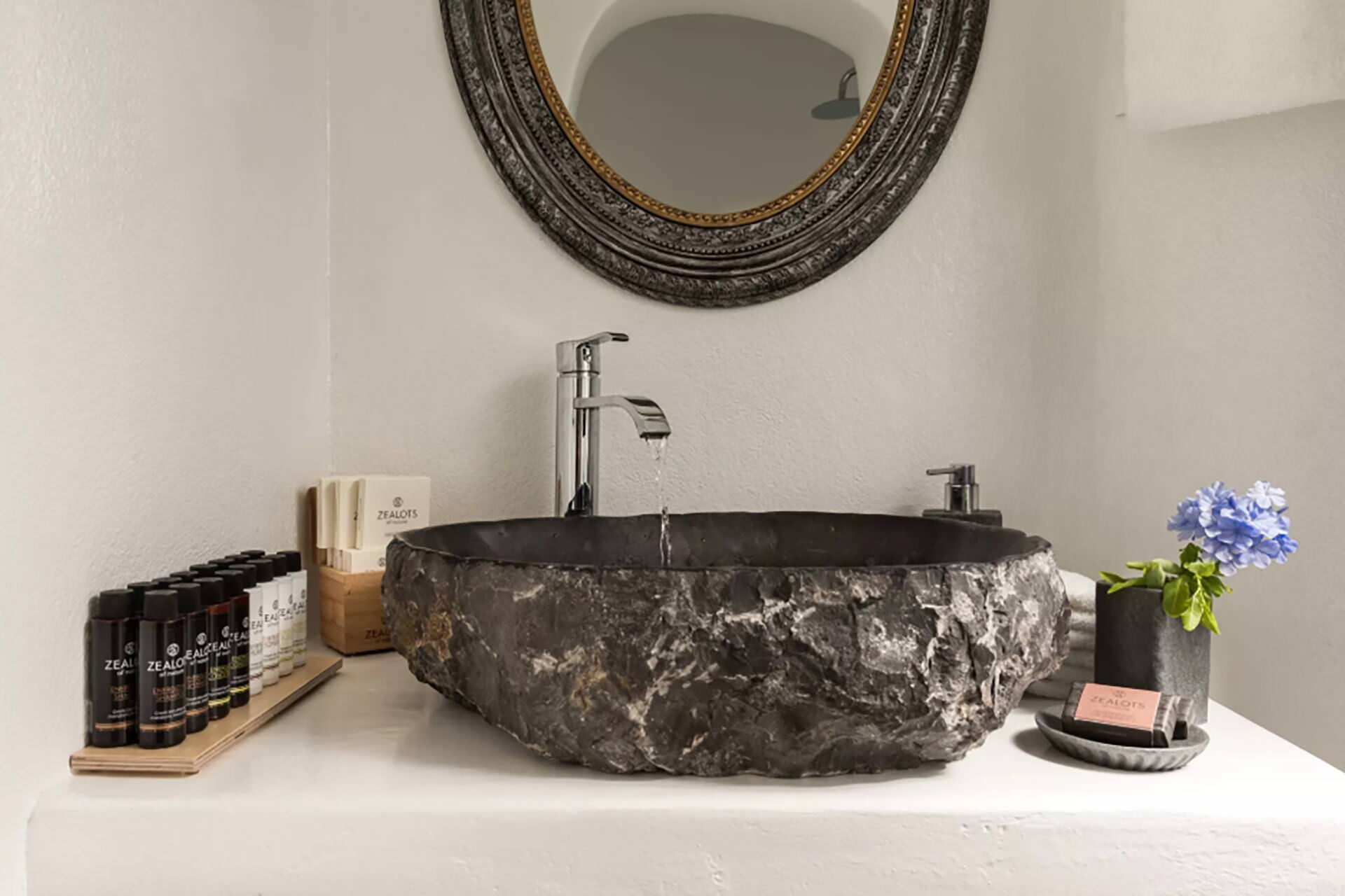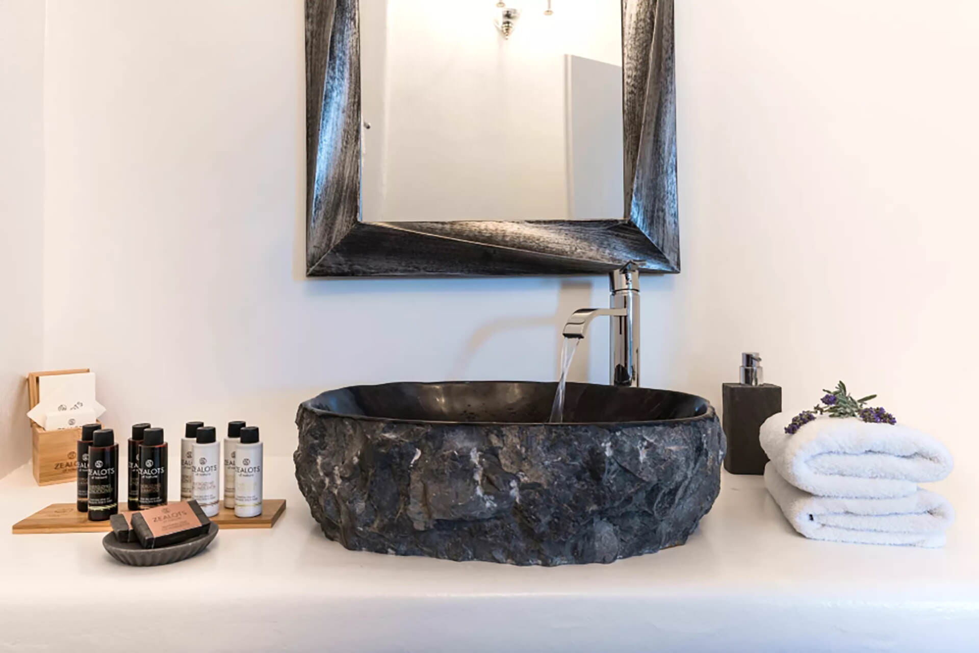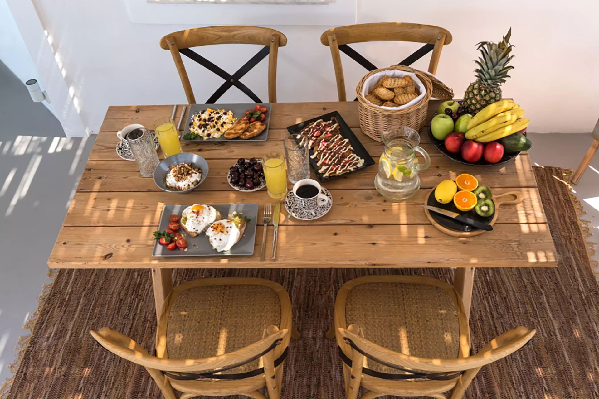 Les espaces extérieurs de Villa Sean sont conçus pour mettre en valeur les paysages naturels environnants. Une piscine privée constitue l'élément central, accompagnée de transats, de mobilier de terrasse et d'un espace dédié aux repas en plein air avec table à manger, le tout offrant des vues sur la caldeira et la mer. Un Jacuzzi extérieur fournit un espace supplémentaire de détente, tandis qu'un petit bar invite à la relaxation. Une terrasse extérieure dédiée est également disponible, adaptée à des activités telles que le yoga ou le Pilates.