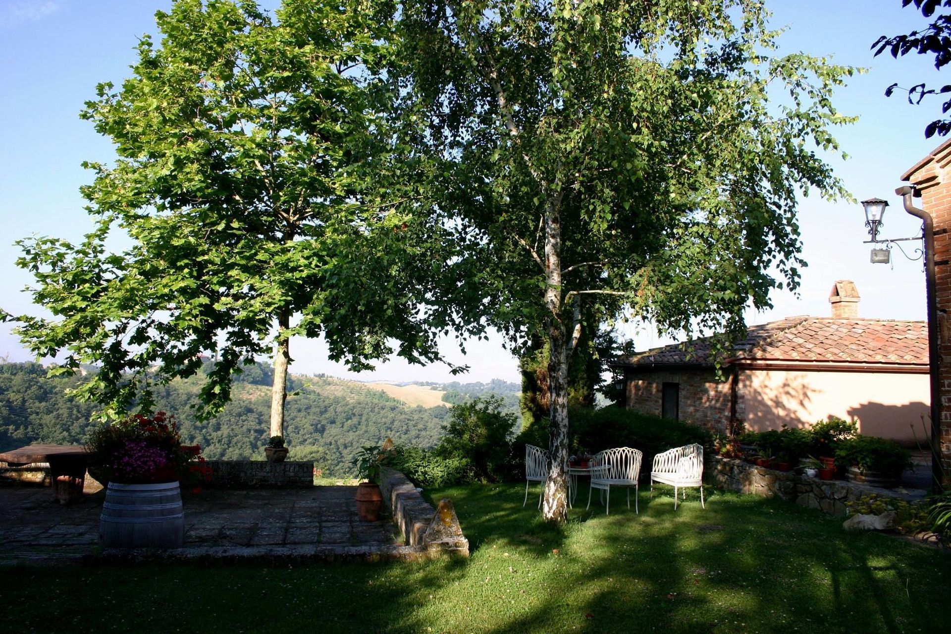 L'appartement a un jardin privé qui est accessible en bas des escaliers principaux. Sur la droite de l'édifice il y a une belle pelouse ouverte avec tables et chaises en bois, barbecue, arbres, plantes et arbustes et une large vue sur la campagne.