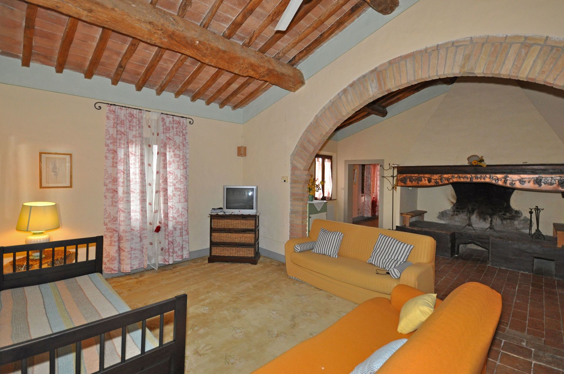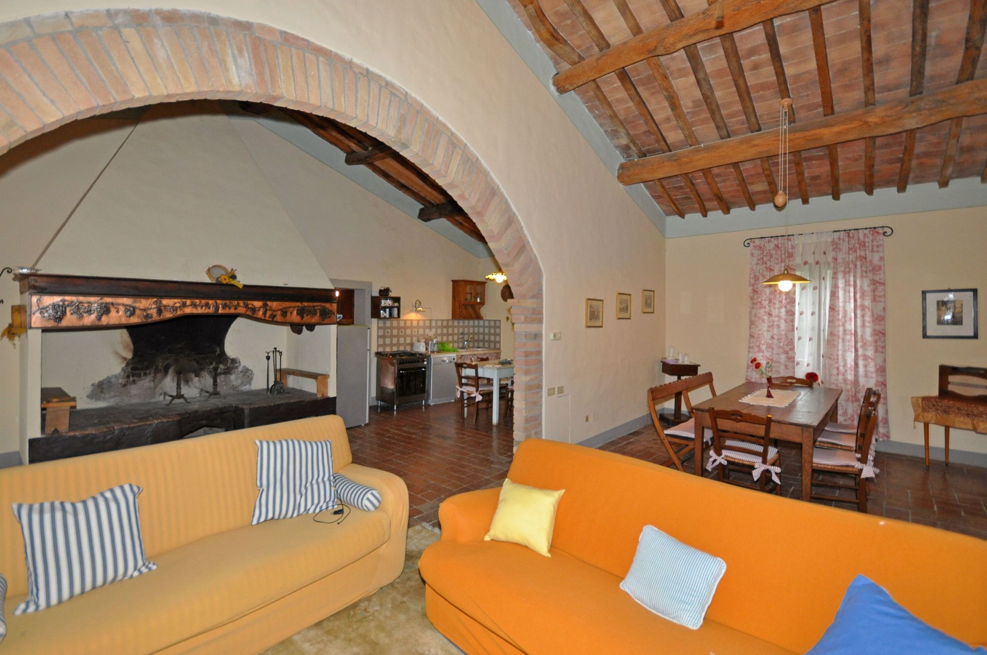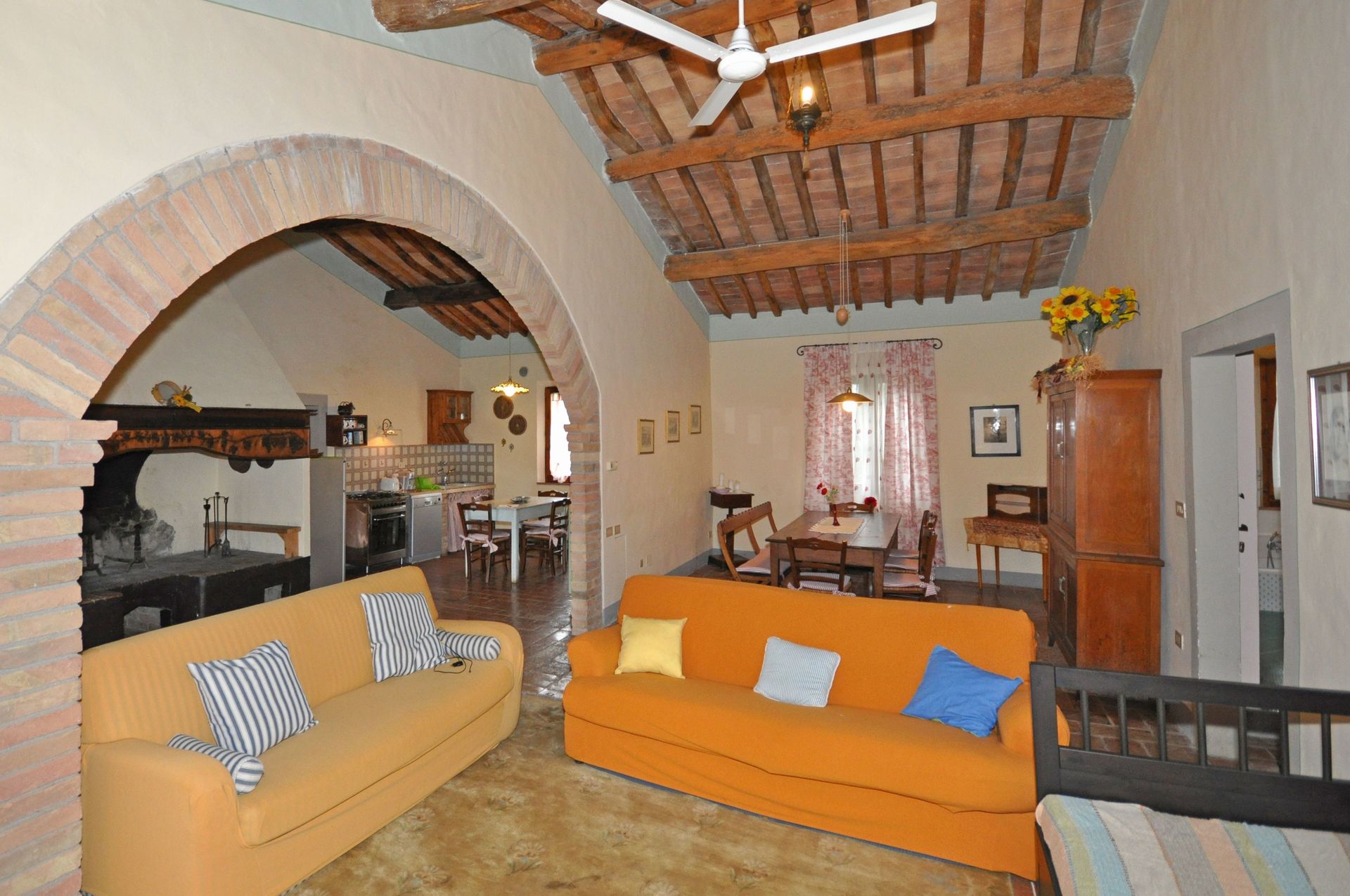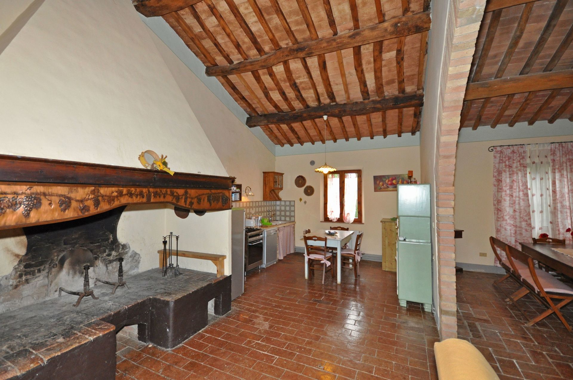 Grand salon - salle à manger avec grande cheminée typique toscane , grande cuisine, une chambre avec lit double, avec 1 divan-lit pour 2 enfants ou 1 adulte, 2 chambres avec 2 lits simples qui peuvent être joints sur demande; 2 salles de bains, une avec une grande douche et l'autre (12 m²) avec douche et baignoire, de grandes fenêtres.