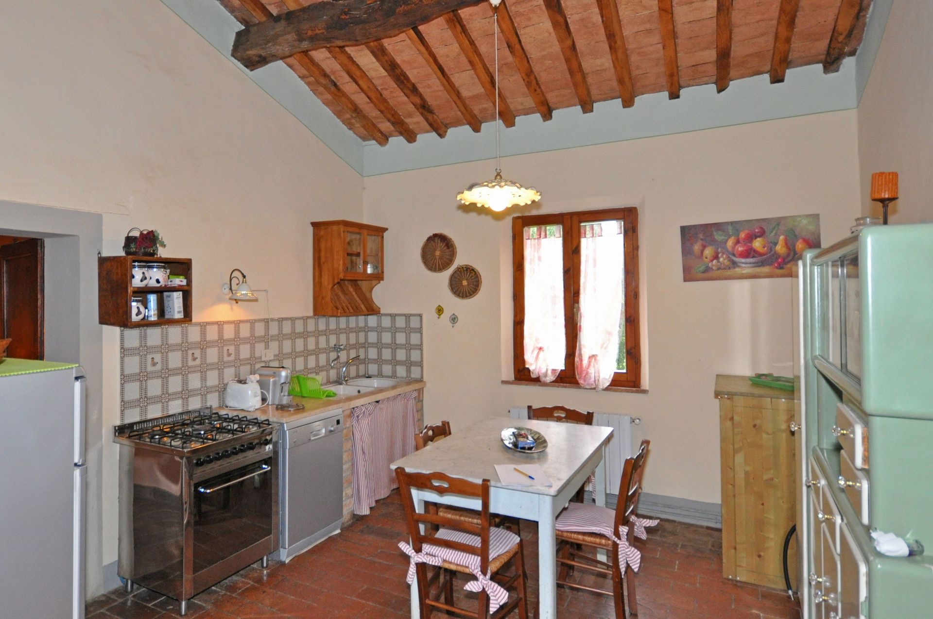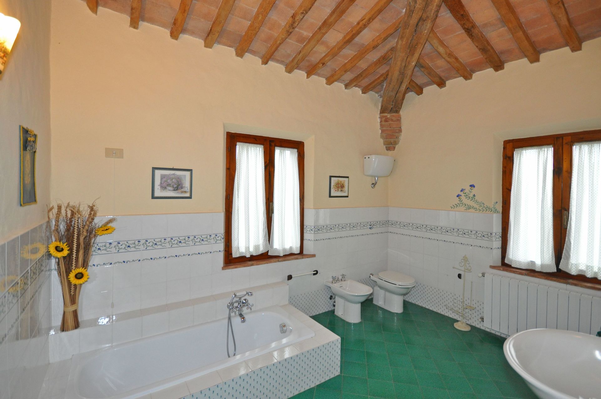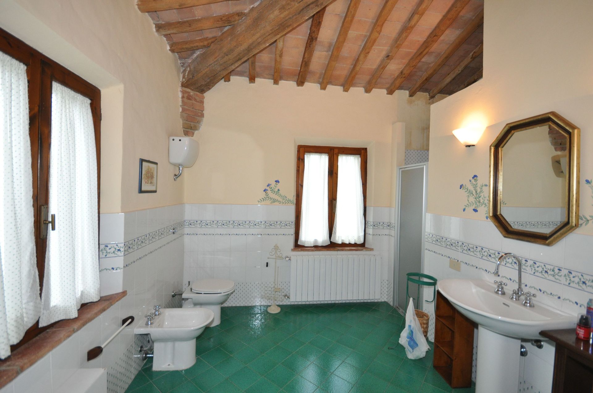 Grand salon - salle à manger avec grande cheminée typique toscane , grande cuisine, une chambre avec lit double, avec 1 divan-lit pour 2 enfants ou 1 adulte, 2 chambres avec 2 lits simples qui peuvent être joints sur demande; 2 salles de bains, une avec une grande douche et l'autre (12 m²) avec douche et baignoire, de grandes fenêtres.