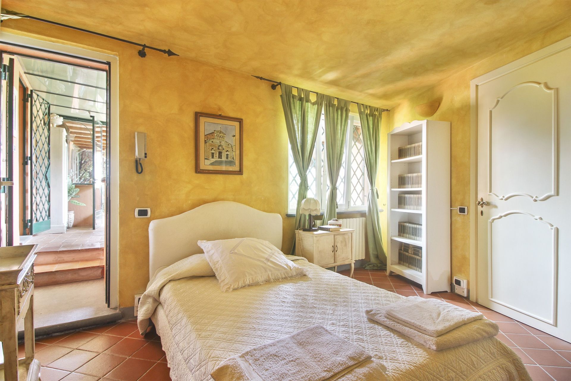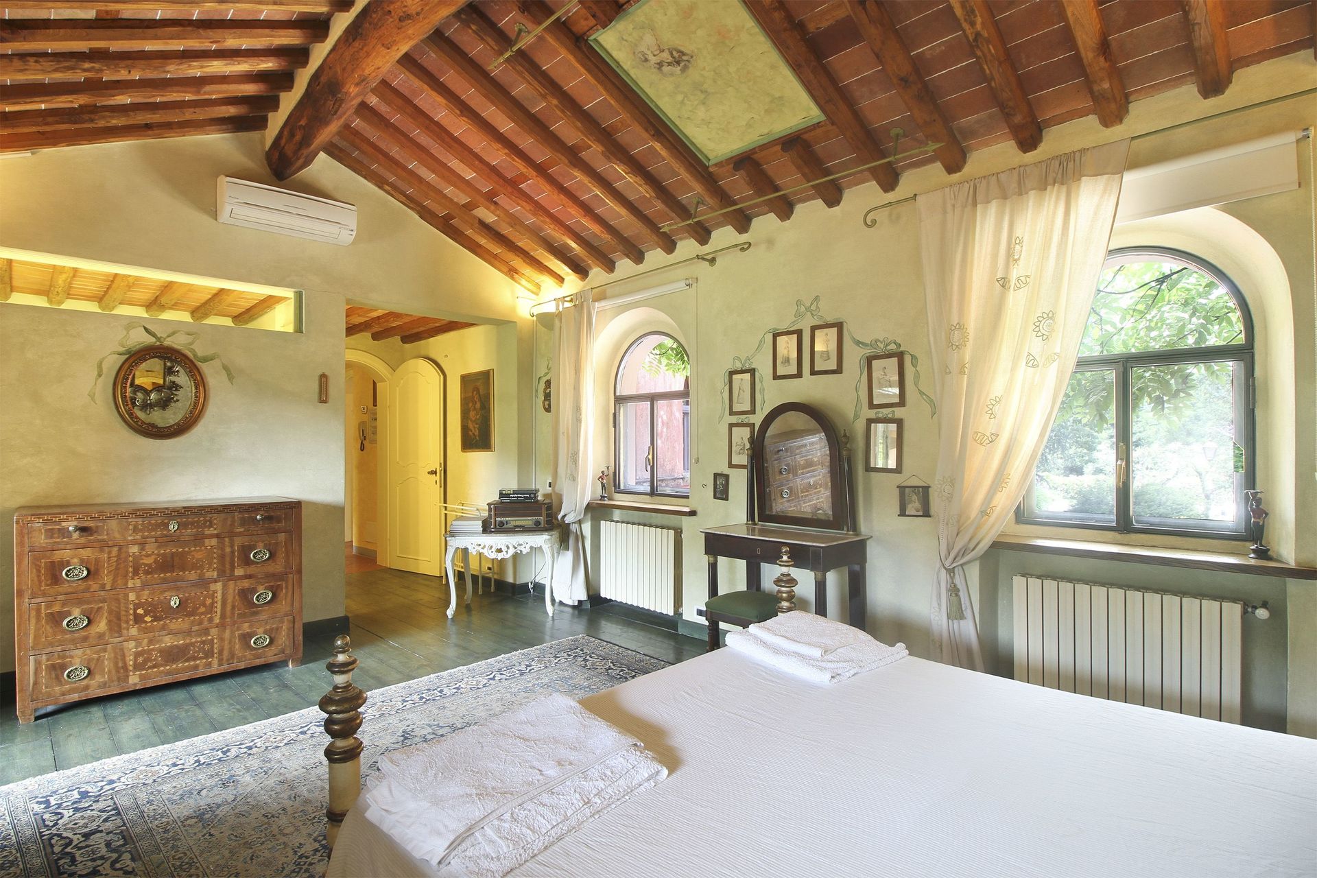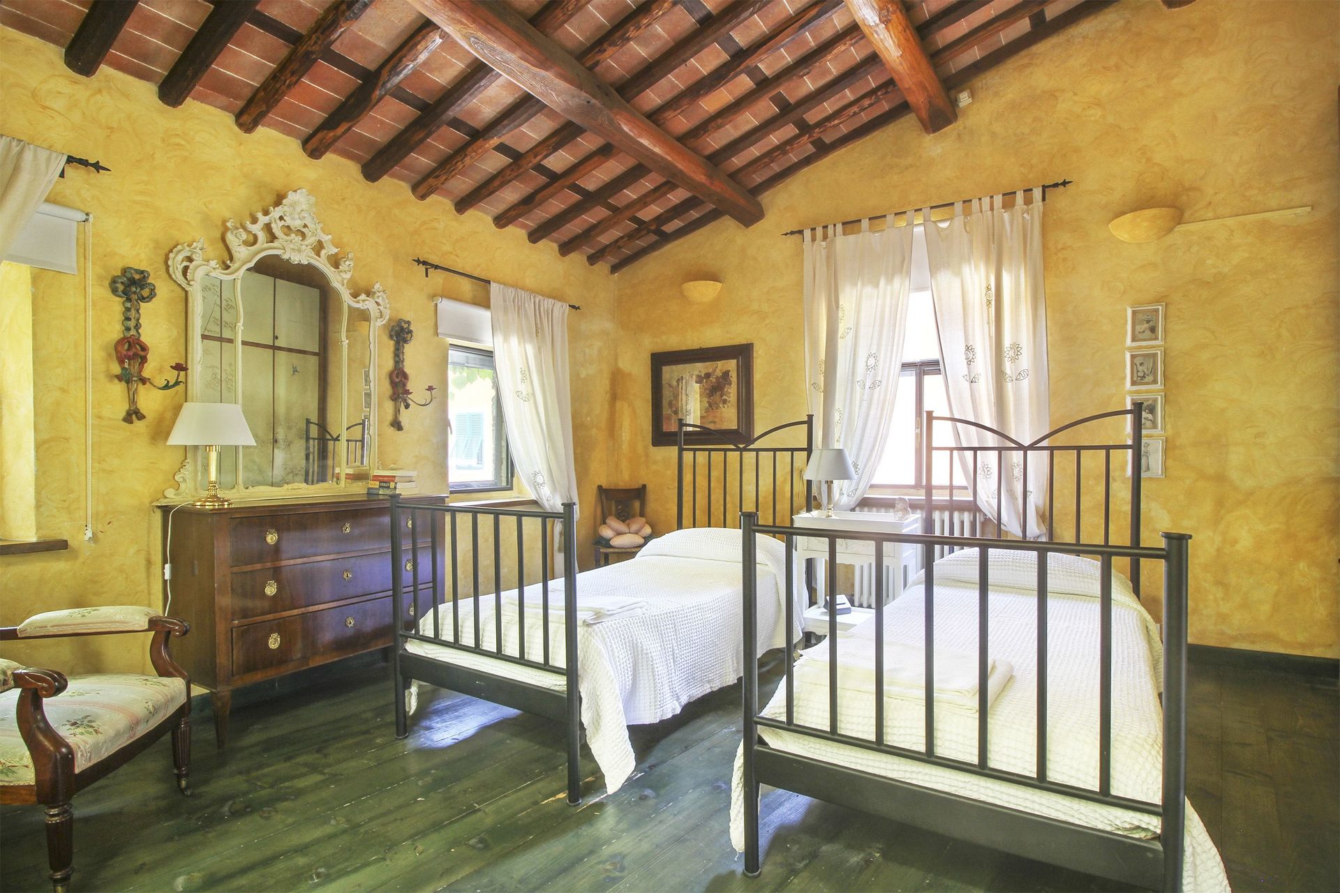 premier étage (accès par un escalier en colimaçon ou par l’extérieur): petit salon/chambre à coucher avec un lit à une place et demie et accès sur une petite véranda (5m2) fermée (vitrée) avec une table pour deux personnes, petit coin-cuisine de passage (petit four électrique, freezer) avec accès sur la petite véranda, une grande chambre double avec accès sur une terrasse couverte (10m2) et salle de bains privée avec douche, une chambre avec deux lits à une place, une chambre de passage avec un lit à une place (fenêtre dans le toit), salle de bains avec baignoire. Air conditionné dans les deux chambres à coucher principales et la petite véranda.