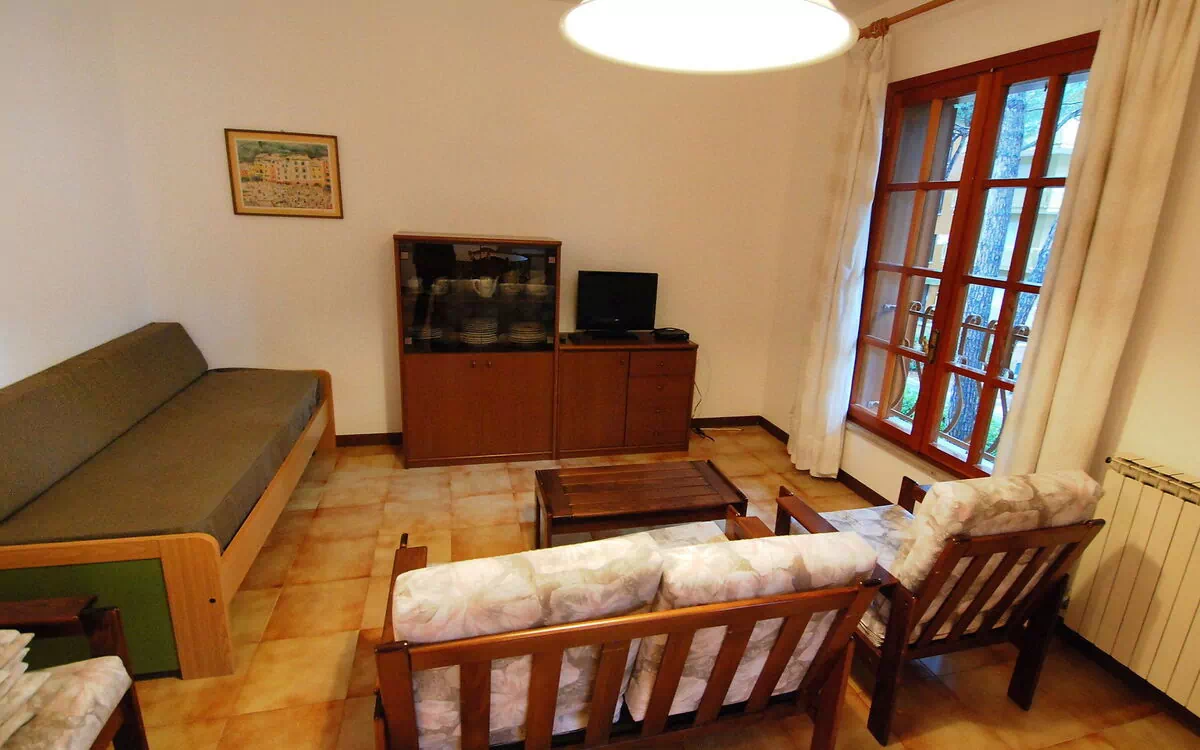 Apt 4 pièces 80 m2 au 1er étage. Logement idéal pour 6 adultes + 2 enfants. Clair, aménagement fonctionnel et confortable: séjour/salle à manger avec 1 divan-lit double et TV. Sortie sur la terrasse. 1 chambre avec 1 lit double. 1 chambre avec 3 lits. 1 chambre avec 1 lit. Coin cuisine (4 plaques de cuisson, four micro-ondes). Bain/bidet/WC, WC séparé. Air-conditionné (en sus). Pas de chauffage. Vue sur le jardin. A disposition: lave-linge. Place de parking (1 Voiture). Veuillez noter: maison non-fumeur. 1 animal/ chien autorisé.