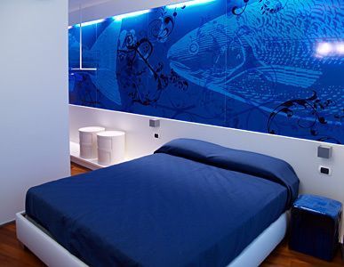 Holiday Apartment with 2 double bedrooms, walls covered with stamps reproducing marine images.