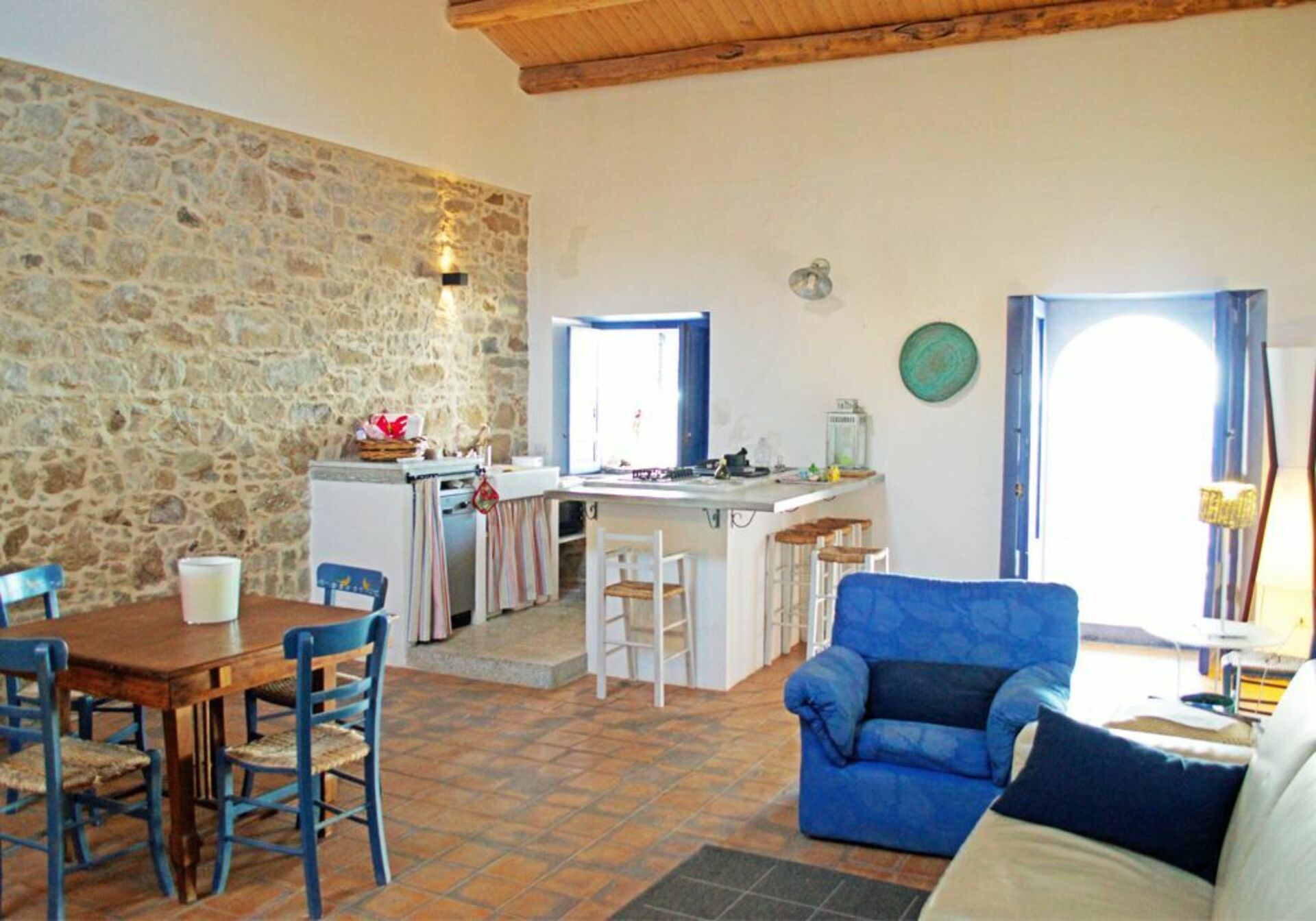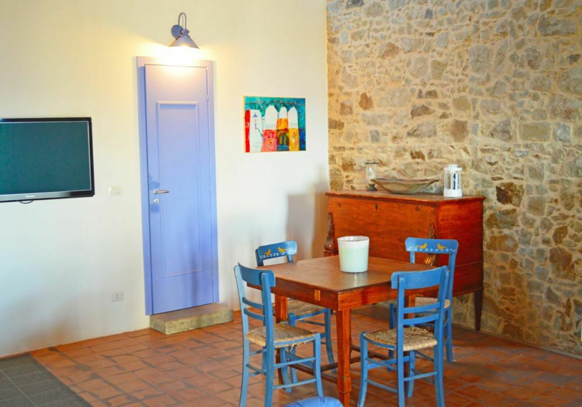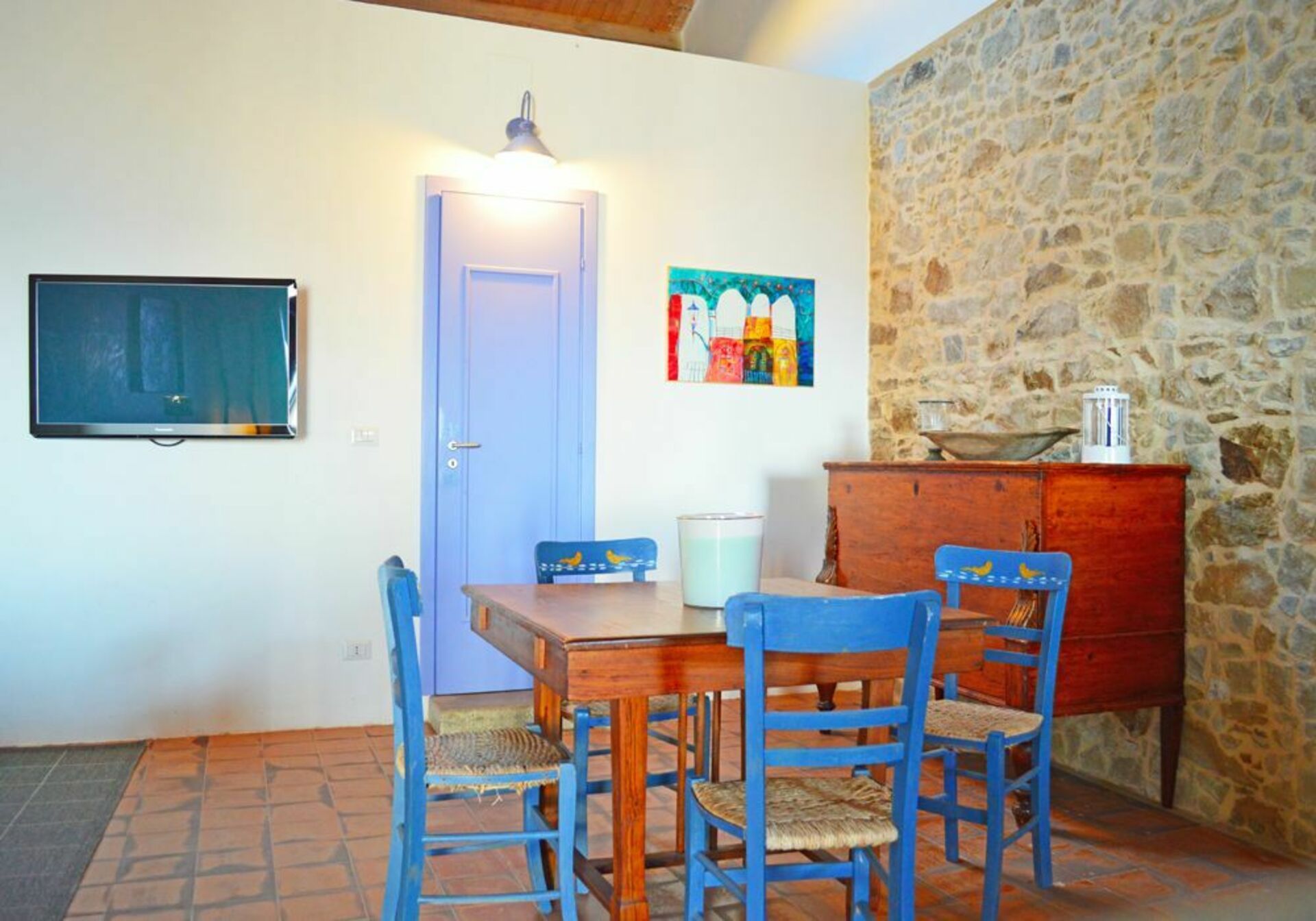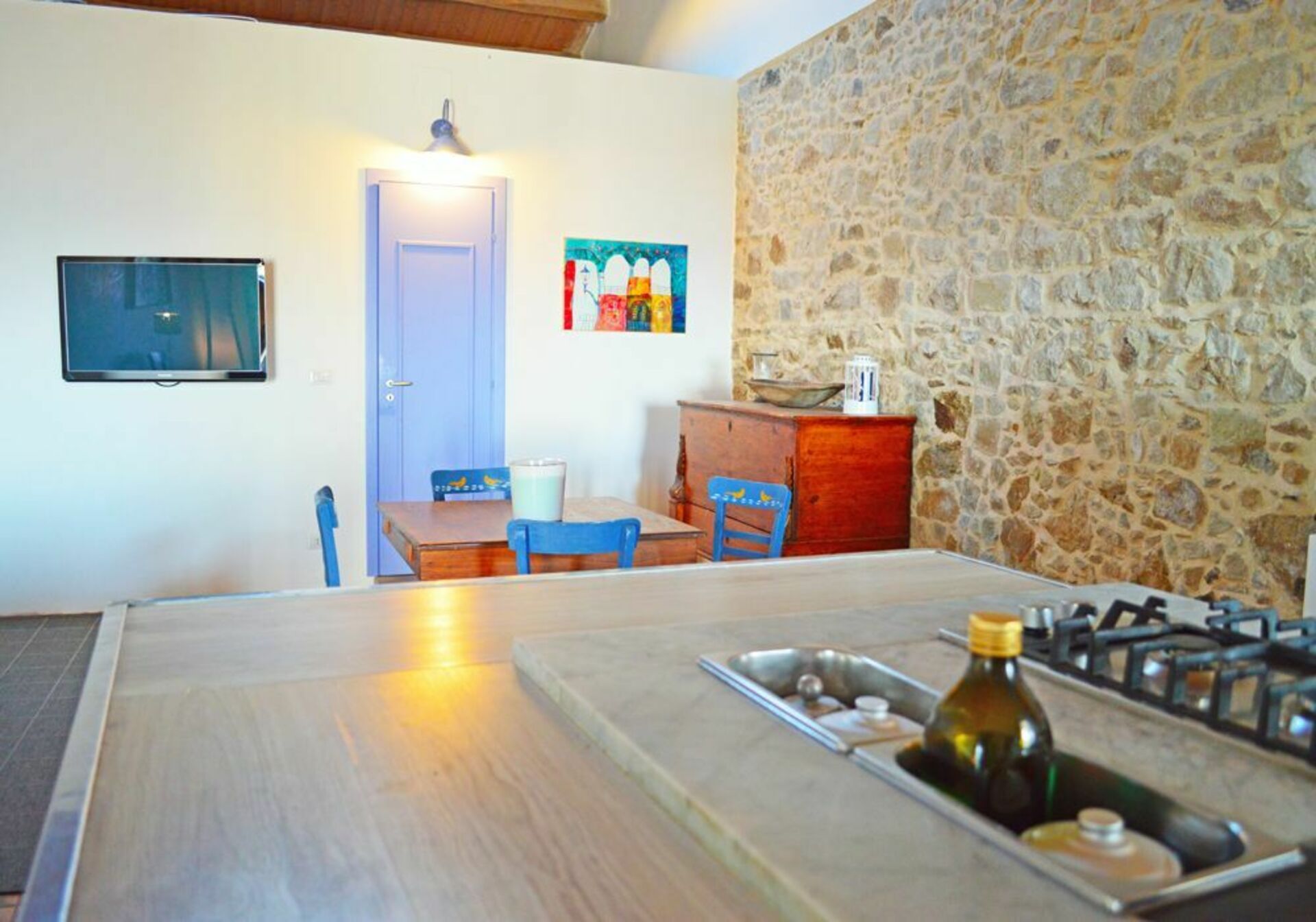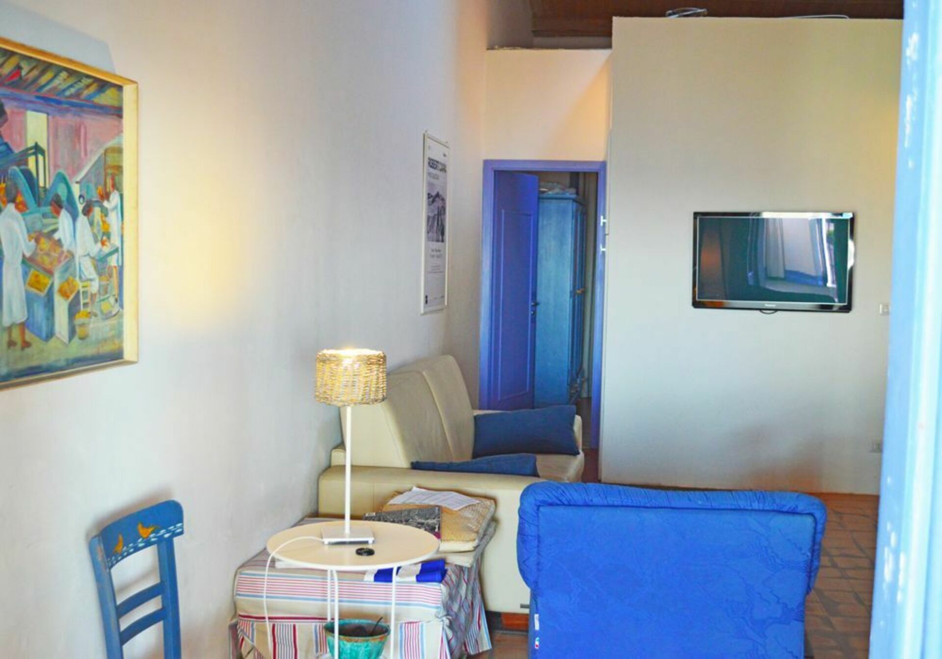 Private entrance, living room with kitchen corner, 1 double sofa bed and 1 single sofa bed, dining table, TV.